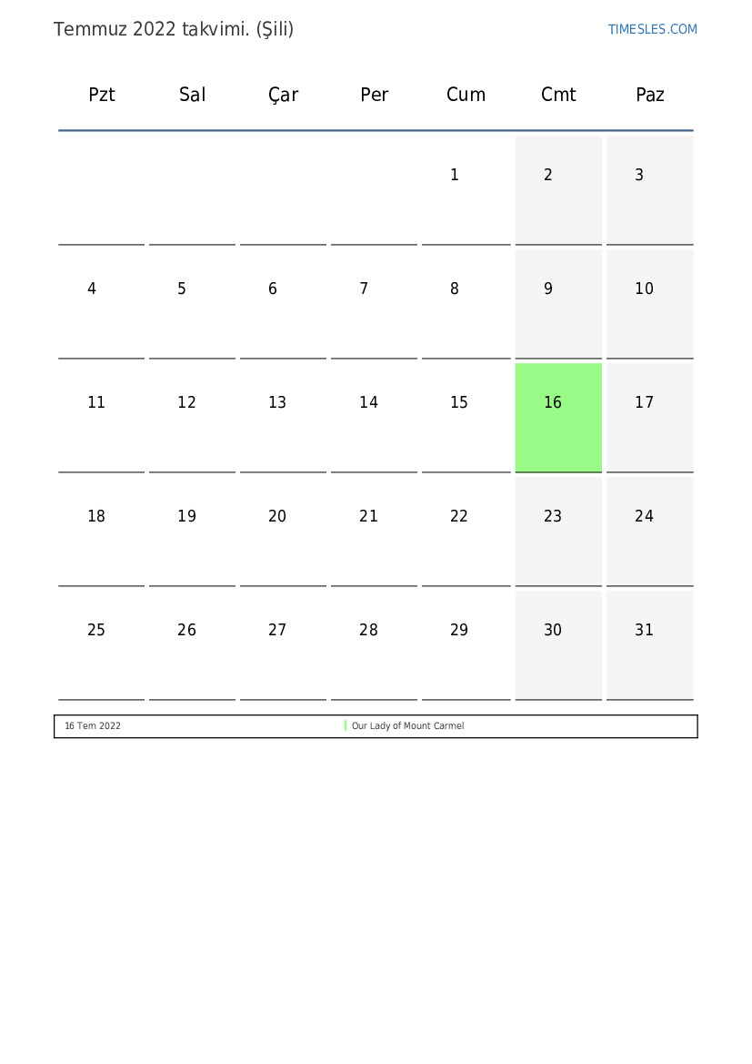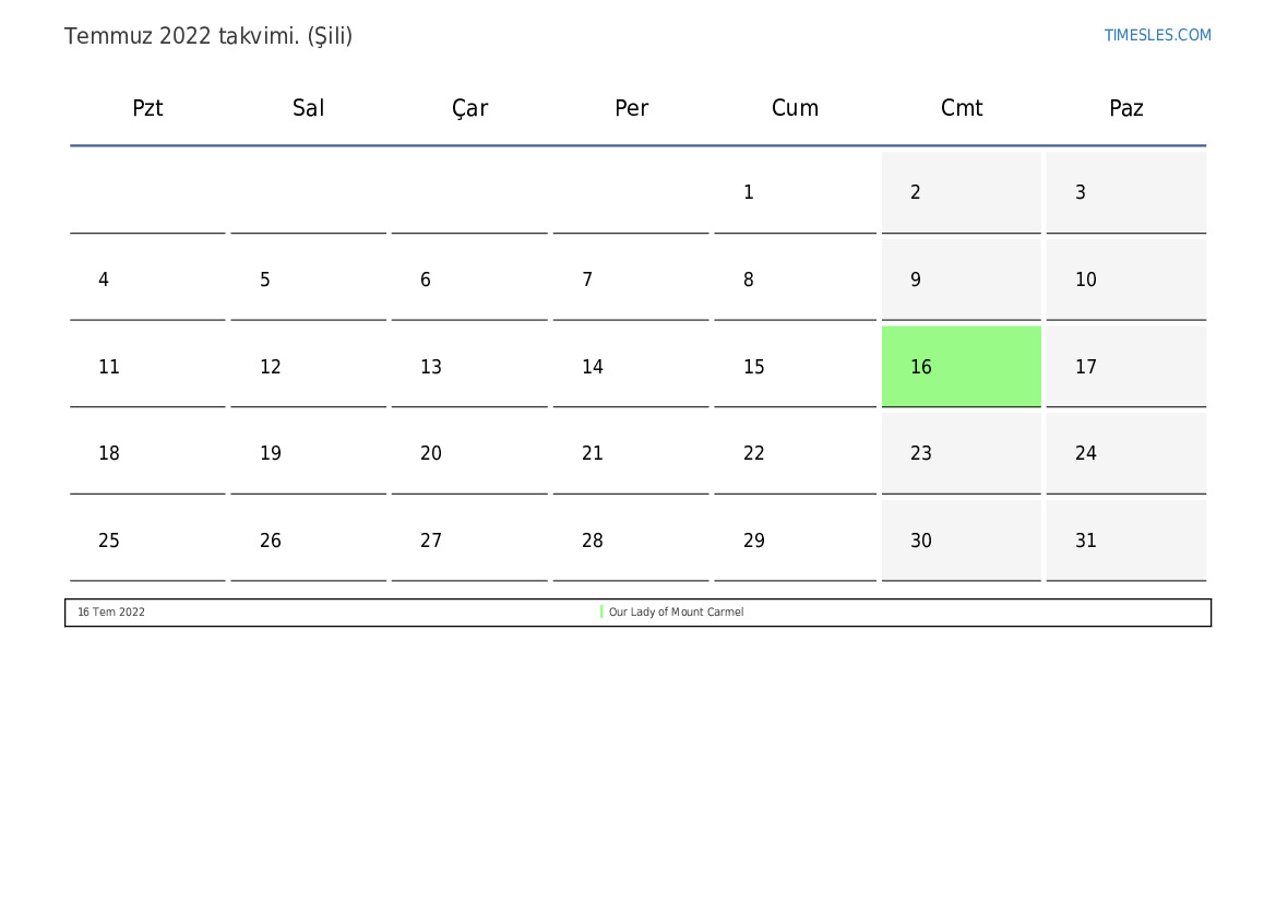 Şili için Temmuz 2022 Tatilleri ve Hafta Sonları Takvimi