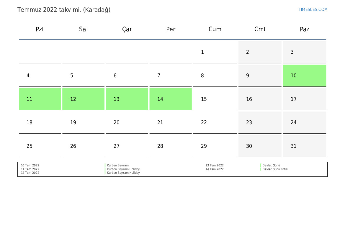 Karadağ için Temmuz 2022 takvimi