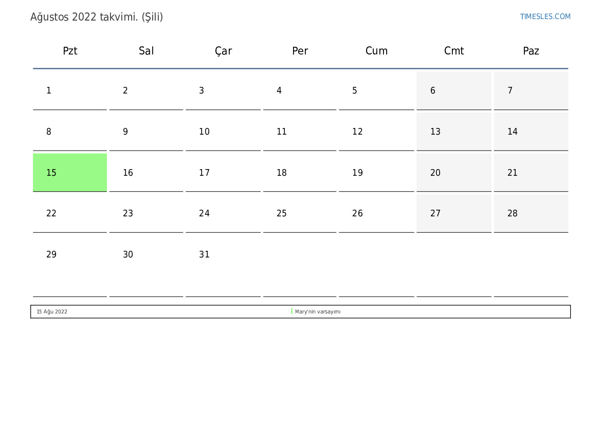 Şili için Ağustos 2022 tatilleri ve hafta sonlarını içeren PDF takvimini indirin ve yazdırın