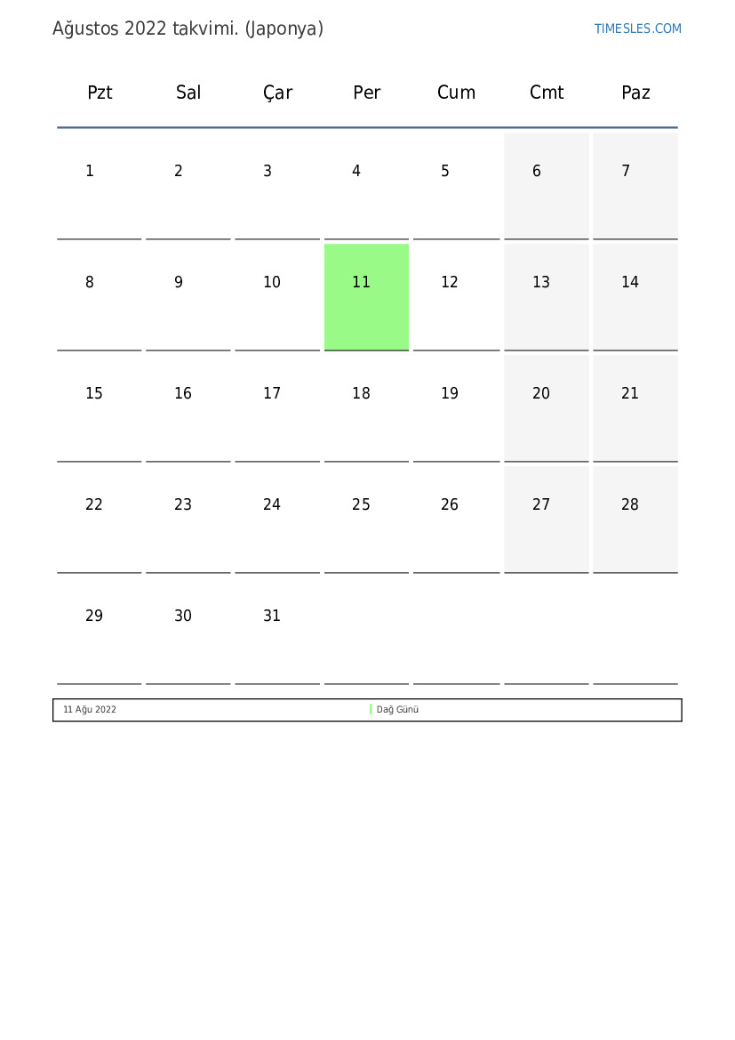 Japonya için Ağustos 2022 tatilleri ve hafta sonlarını içeren PDF takvimini indirin ve yazdırın