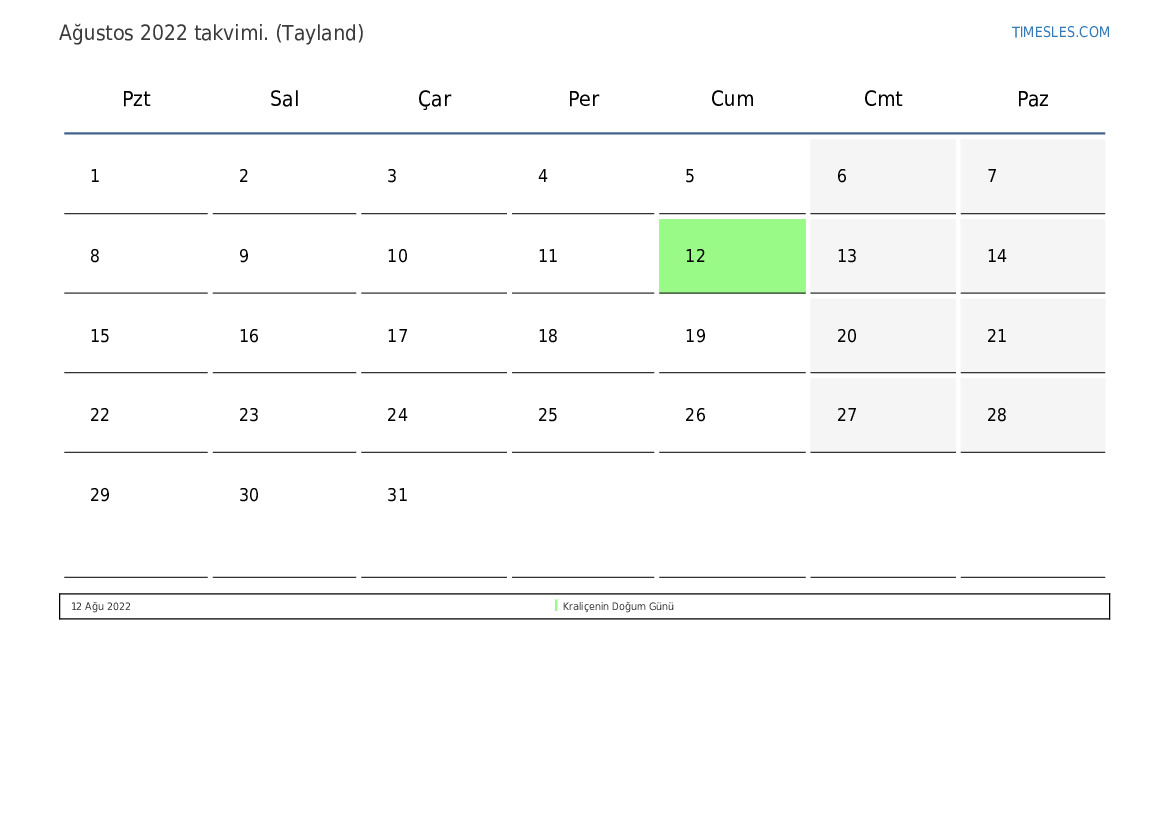 Tayland için Ağustos 2022 tatilleri ve hafta sonlarını içeren PDF takvimini indirin ve yazdırın