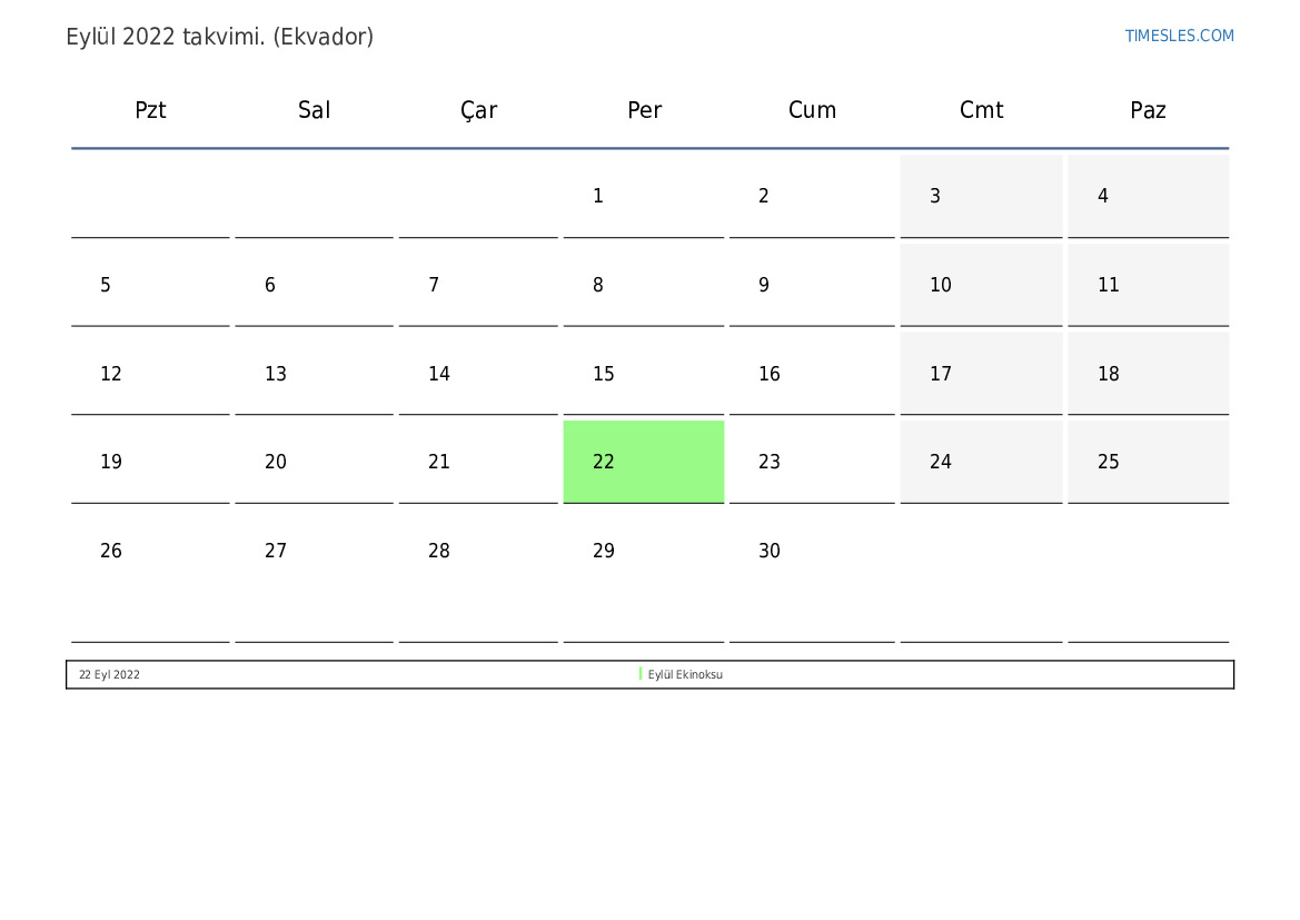 Ekvador için Eylül 2022 tatilleri ve hafta sonlarını içeren PDF takvimini indirin ve yazdırın