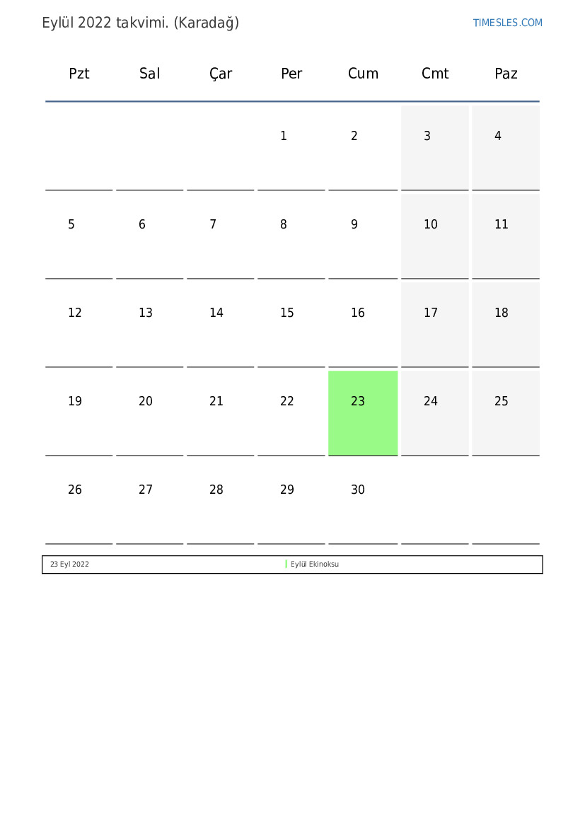 Eylül ayı 30 gün. Bu, 2022'in 9 ayı. Yılın mevsimi: sonbahar. Eylül ayı Perşembe günü başlar ve Cuma gününde biter. 2022 Eylül ayında Karadağ'da 1 tatil ve izin günü var.
