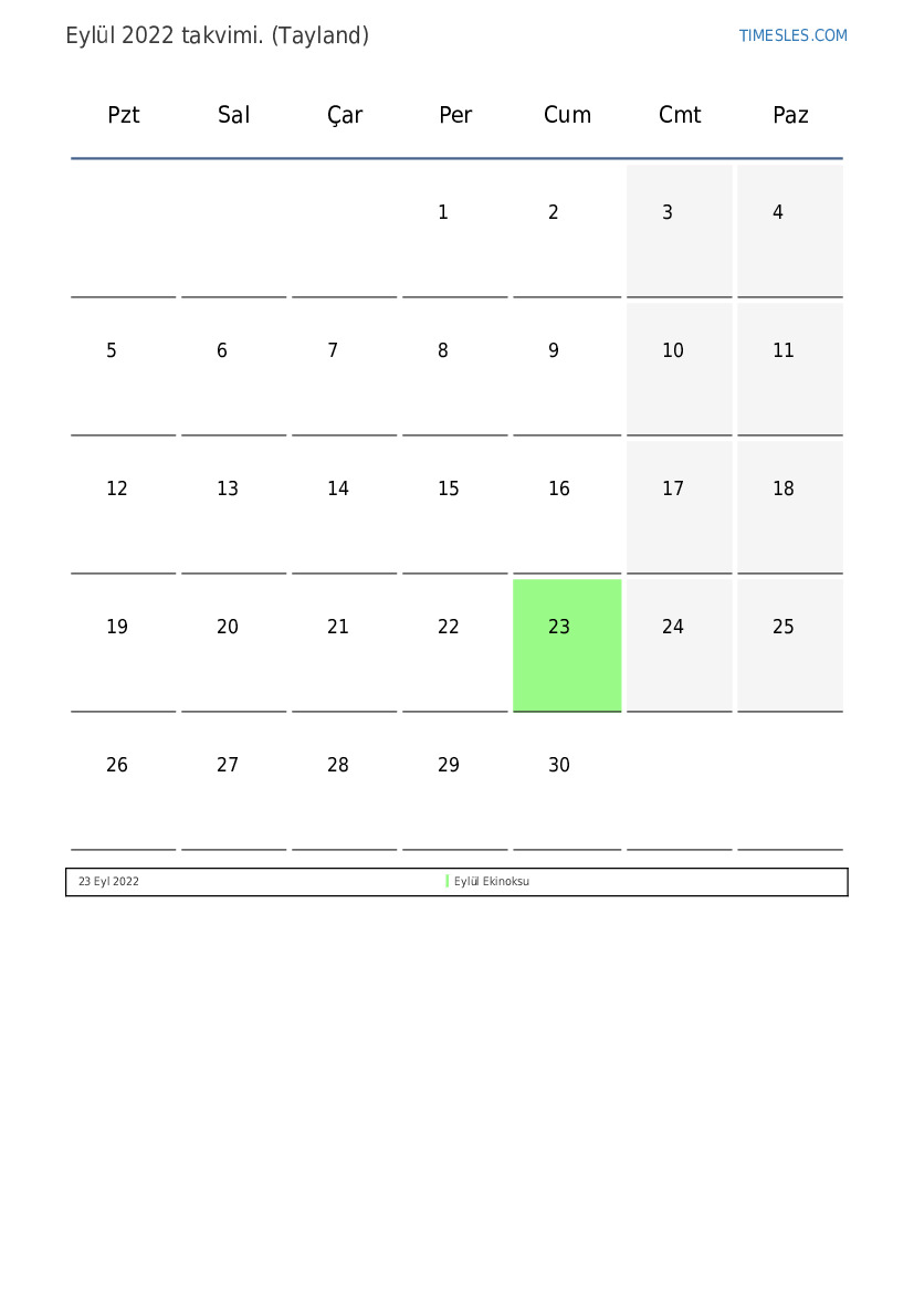 Eylül ayı 30 gün. Bu, 2022'in 9 ayı. Yılın mevsimi: sonbahar. Eylül ayı Perşembe günü başlar ve Cuma gününde biter. 2022 Eylül ayında Tayland'da 1 tatil ve izin günü var.