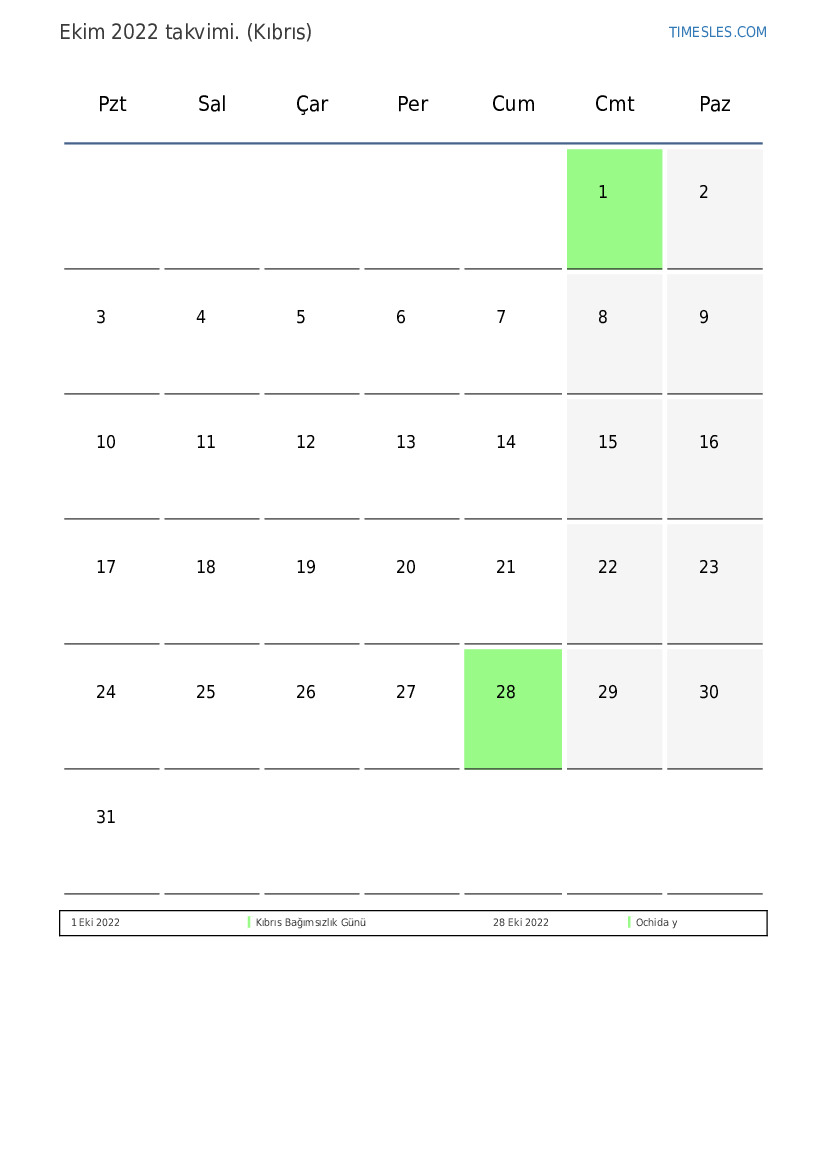 Kıbrıs için Ekim 2022 Tatilleri ve Hafta Sonları Takvimi