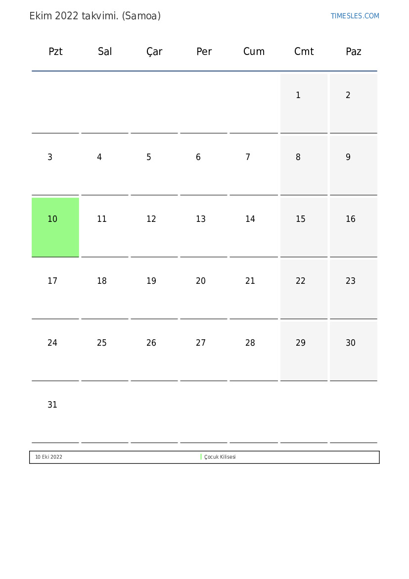 Samoa için Ekim 2022 tatilleri ve hafta sonlarını içeren PDF takvimini indirin ve yazdırın