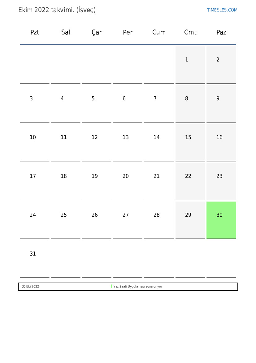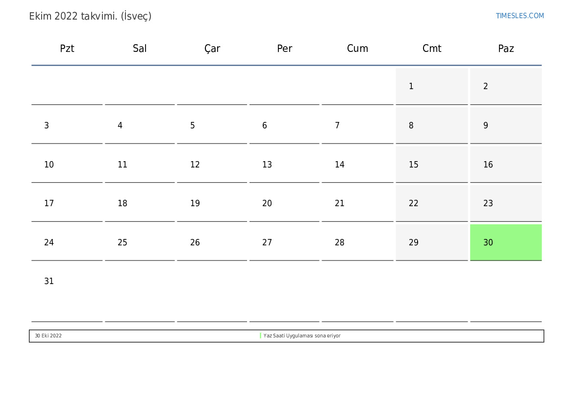 İsveç için Ekim 2022 takvimi