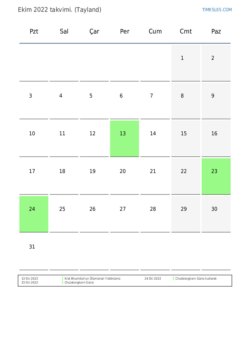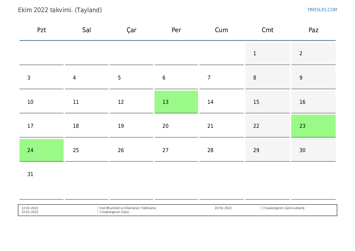Tayland için Ekim 2022 tatilleri ve hafta sonlarını içeren PDF takvimini indirin ve yazdırın