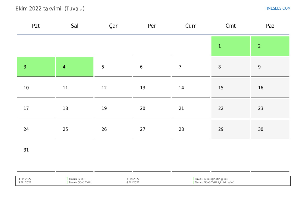 Tuvalu için Ekim 2022 tatilleri ve hafta sonlarını içeren PDF takvimini indirin ve yazdırın