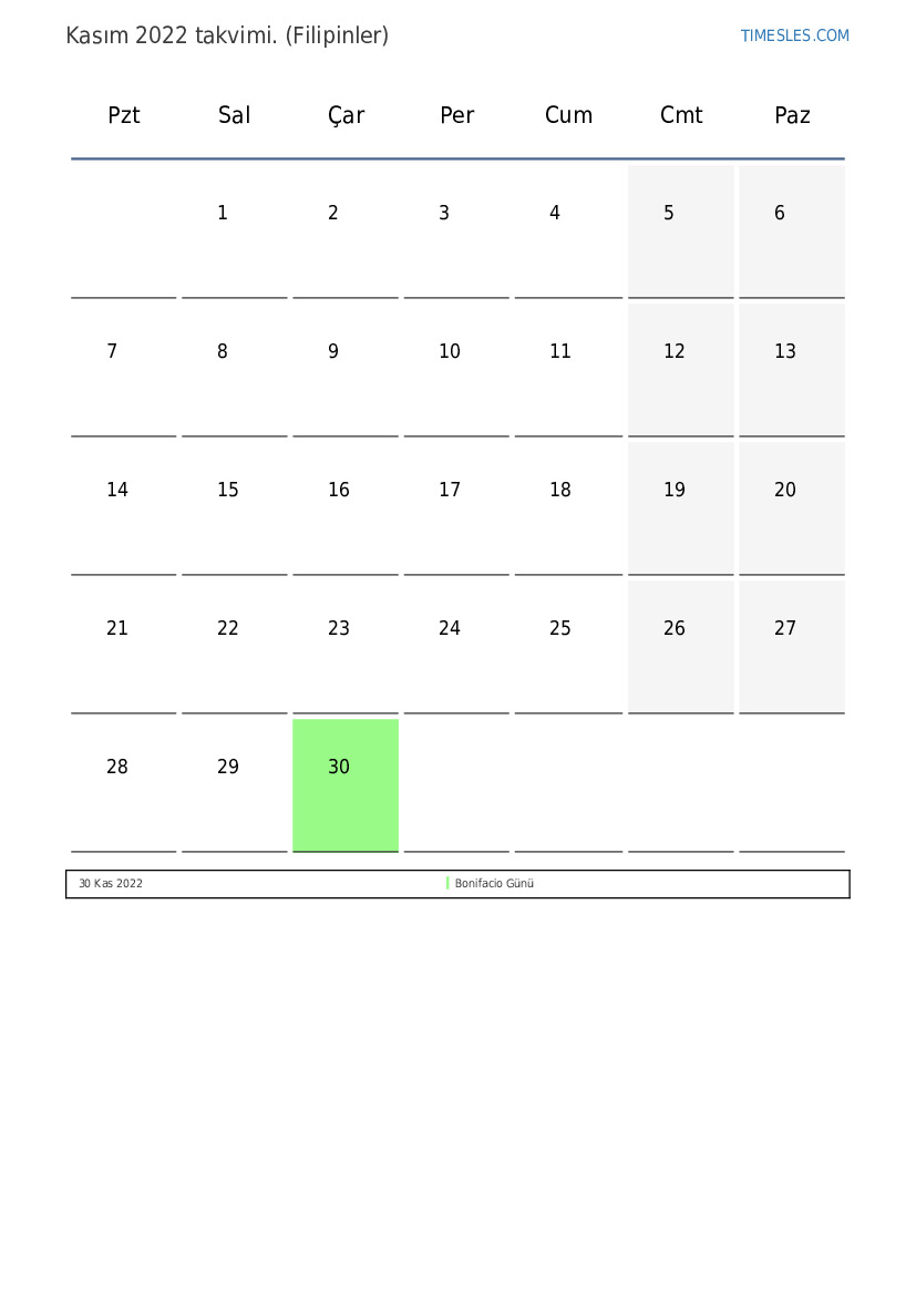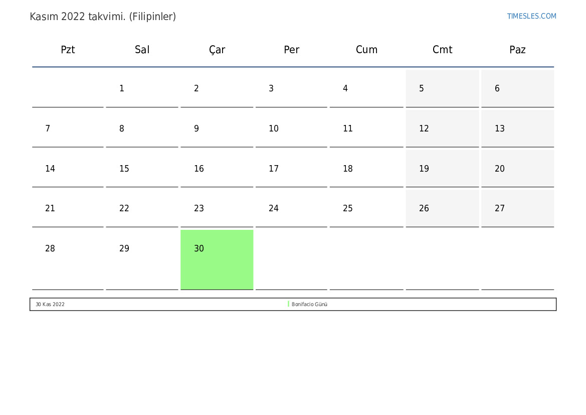 Filipinler için Kasım 2022 Tatilleri ve Hafta Sonları Takvimi