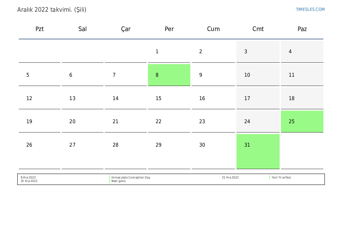 Aralık ayı 31 gün. Bu, 2022'in 12 ayı. Yılın mevsimi: kış. Aralık ayı Perşembe günü başlar ve Cumartesi günü biter. 2022 Aralık ayında Şili'de 4 tatil ve tatil günleri var.