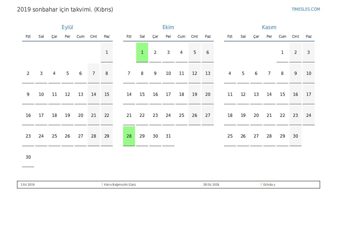 Kıbrıs için 2019 sonbahar için tatil ve hafta sonları takvimi
