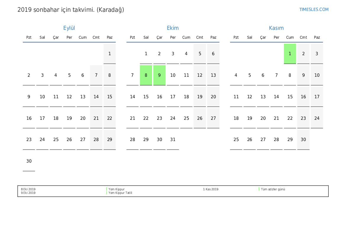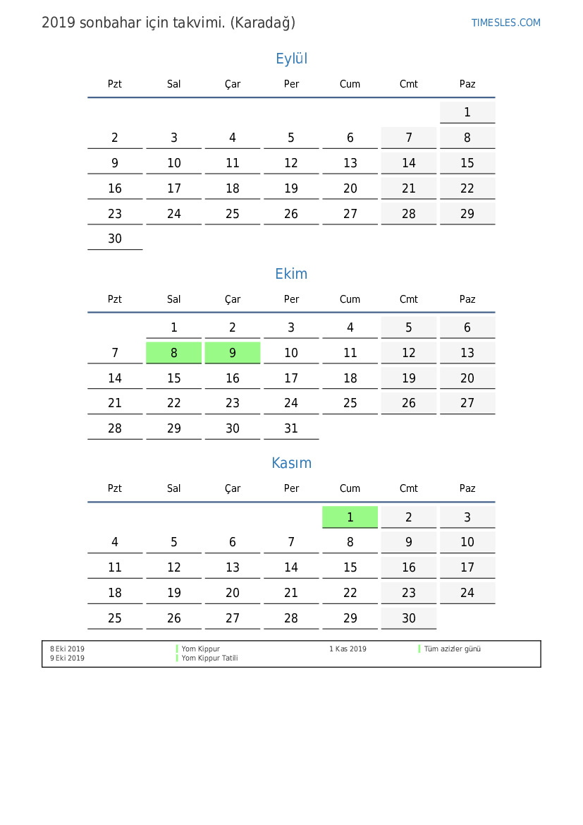 Karadağ için 2019 sonbahar için tatiller ve hafta sonları içeren PDF takvimini indirin ve yazdırın