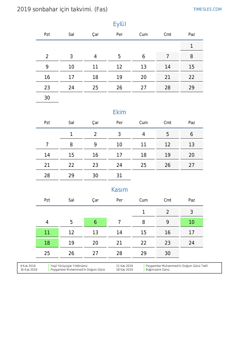 Fas için 2019 sonbahar için tatiller ve hafta sonları içeren PDF takvimini indirin ve yazdırın