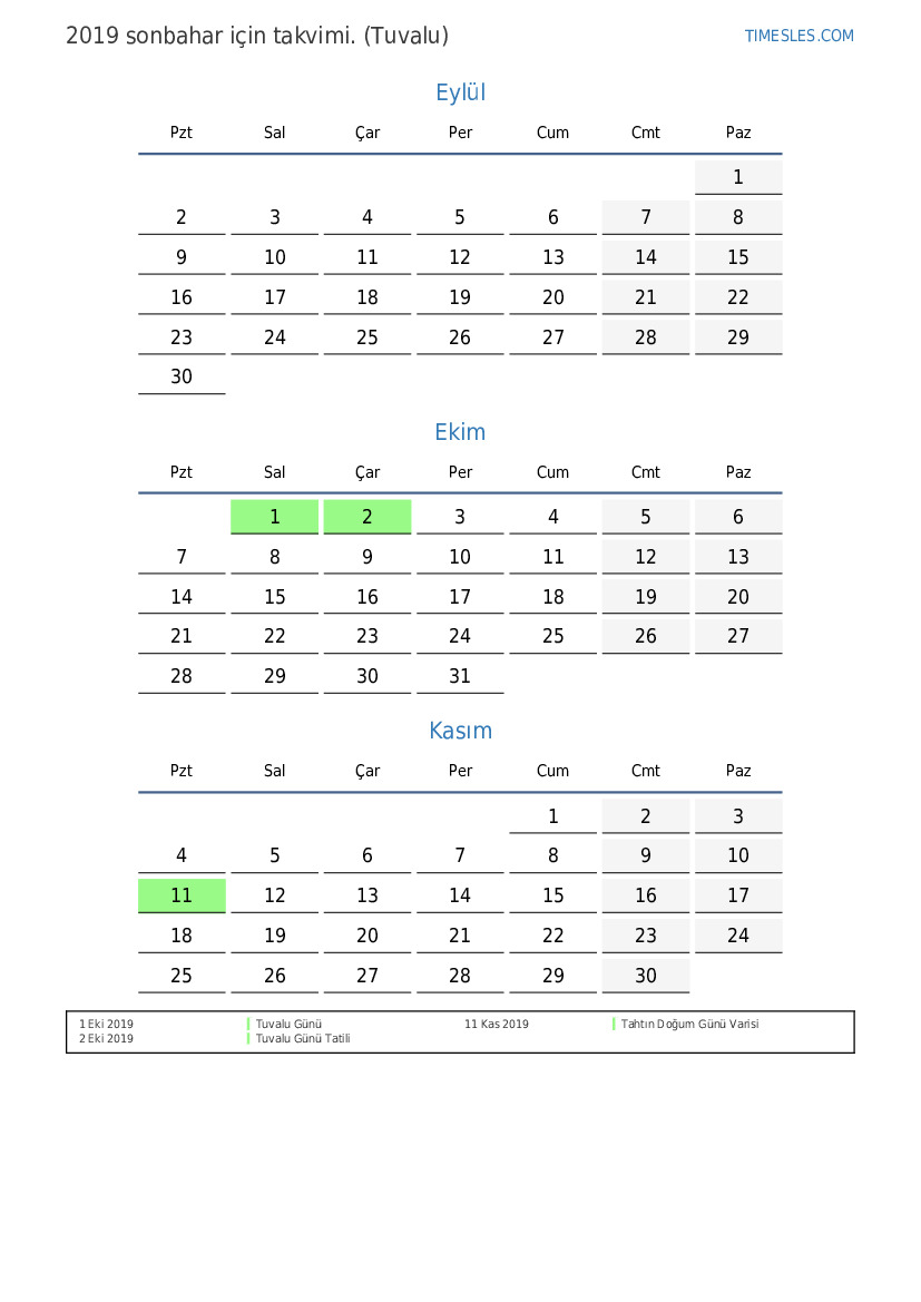 Tuvalu için 2019 sonbahar için tatiller ve hafta sonları içeren PDF takvimini indirin ve yazdırın