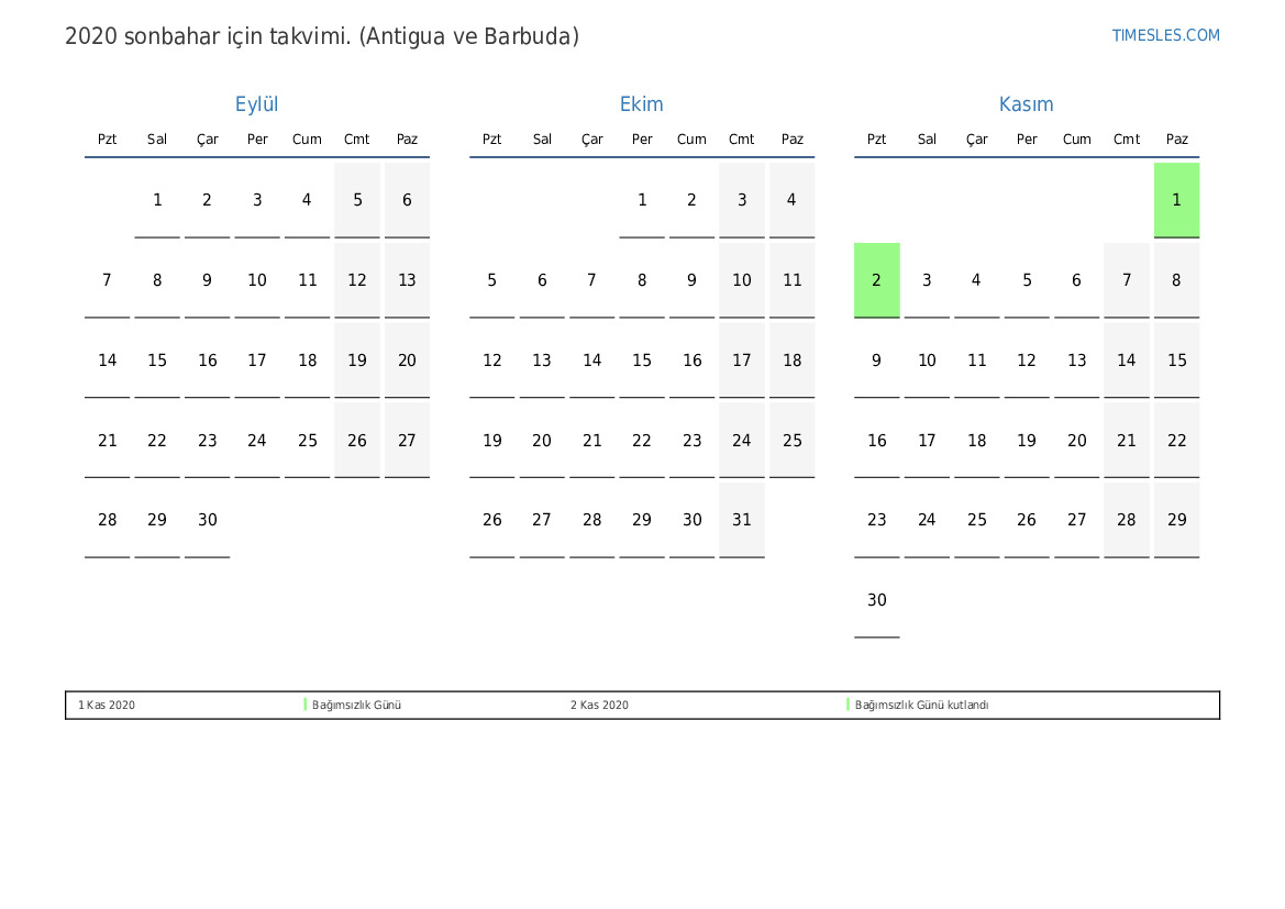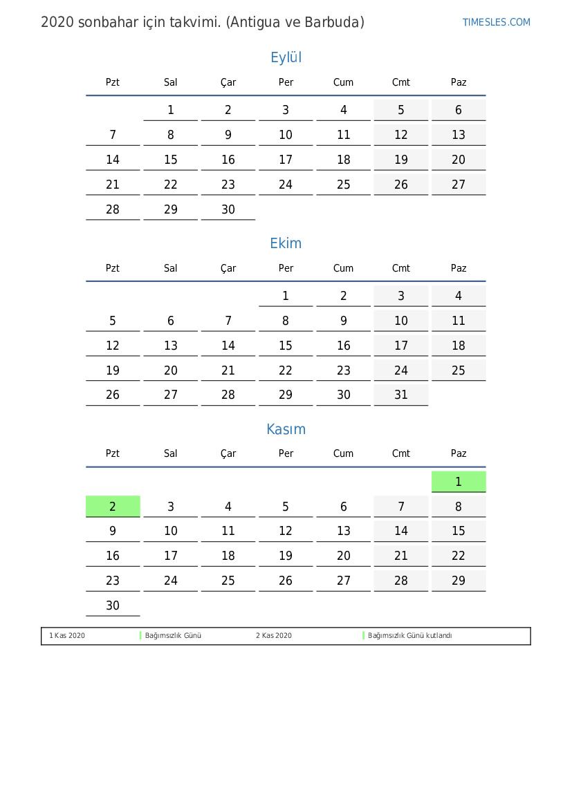 Antigua ve Barbuda için 2020 sonbahar için tatiller ve hafta sonları içeren PDF takvimini indirin ve yazdırın