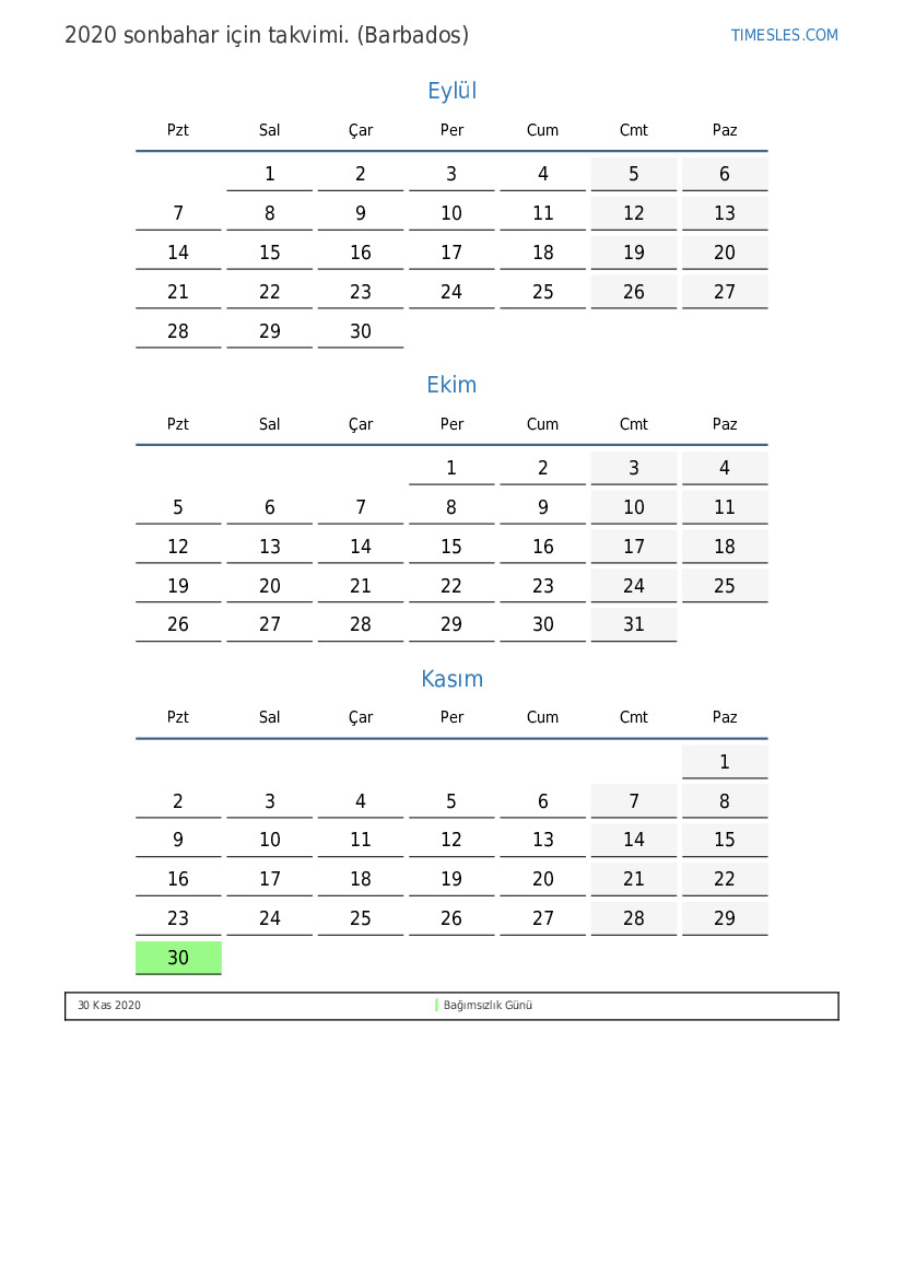 Barbados için 2020 sonbahar için tatiller ve hafta sonları içeren PDF takvimini indirin ve yazdırın