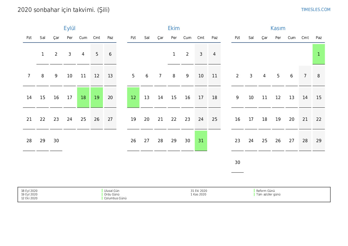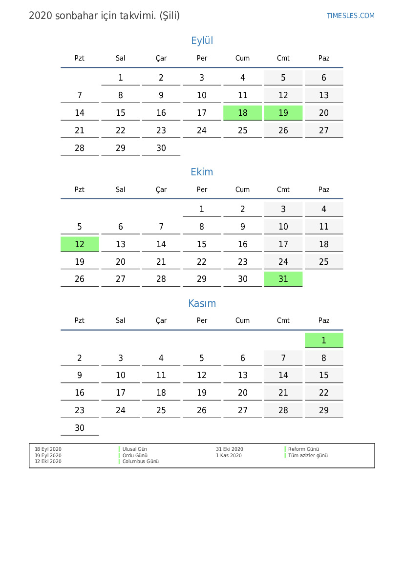 Şili için 2020 sonbahar için tatil ve hafta sonları takvimi