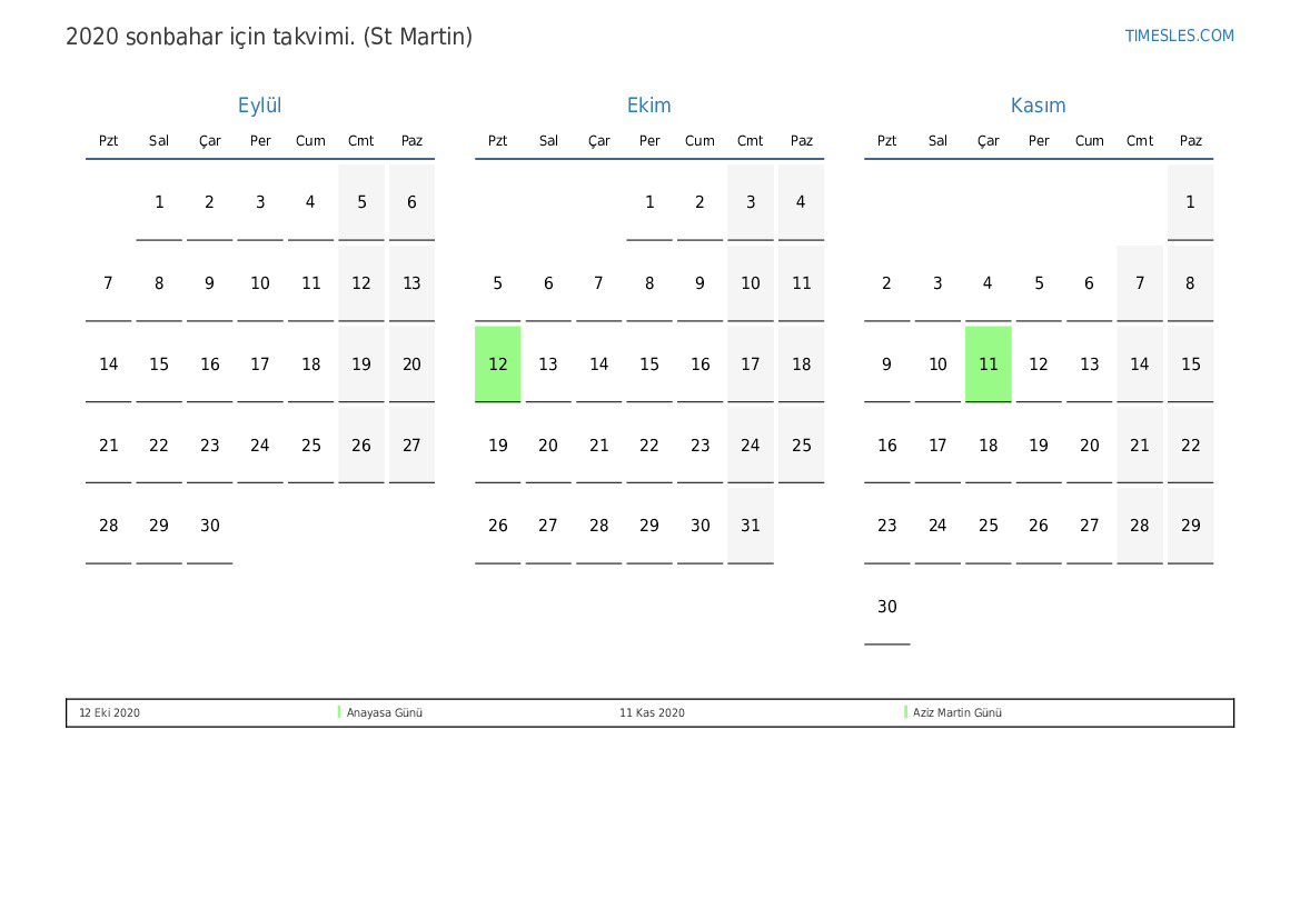Sint Maarten için 2020 sonbahar için tatiller ve hafta sonları içeren PDF takvimini indirin ve yazdırın