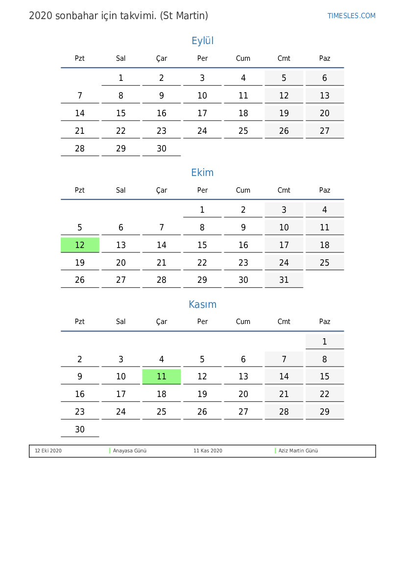 2020 Sonbaharda Sint Maarten şehrinde 3 tatil ve tatil günleri var. Sonbahar 2020 Salı günü başlar ve Pazartesi gününde biter.