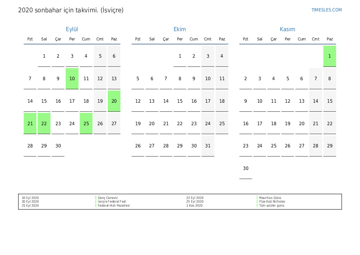 İsviçre için 2020 sonbahar için tatil ve hafta sonları takvimi