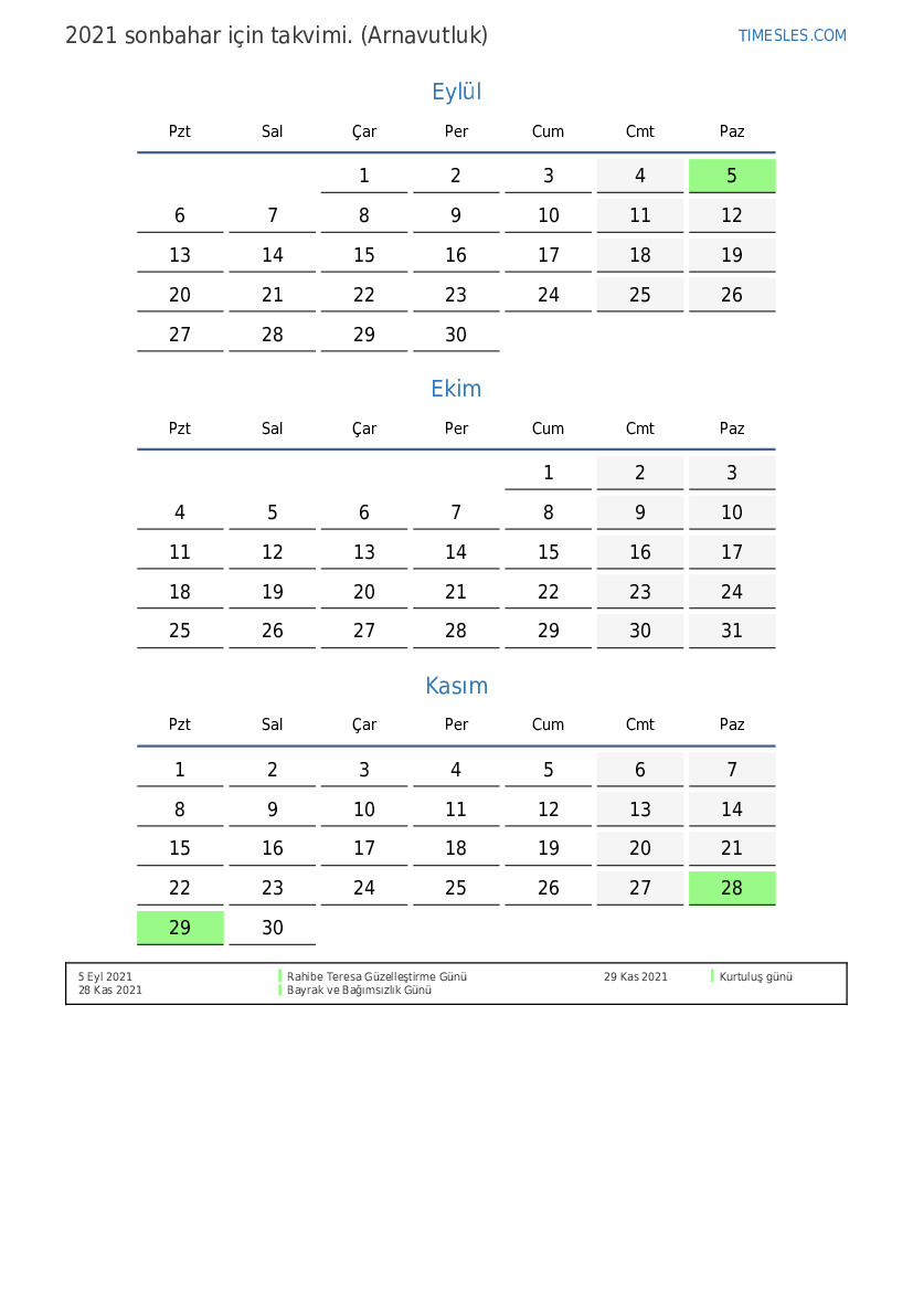 Arnavutluk için 2021 sonbahar için tatiller ve hafta sonları içeren PDF takvimini indirin ve yazdırın