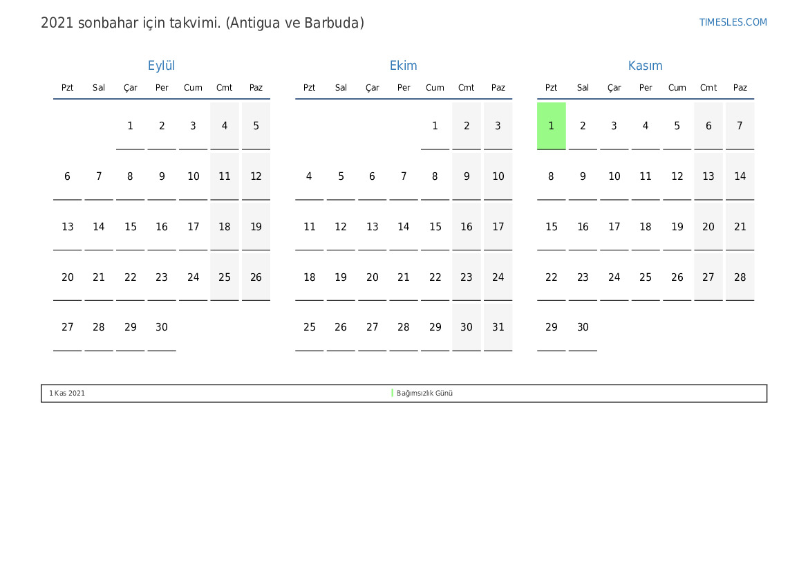 Antigua ve Barbuda için 2021 sonbahar için tatiller ve hafta sonları içeren PDF takvimini indirin ve yazdırın