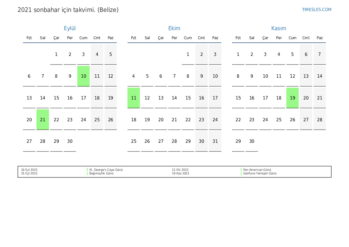 Belize için 2021 sonbahar için tatiller ve hafta sonları içeren PDF takvimini indirin ve yazdırın