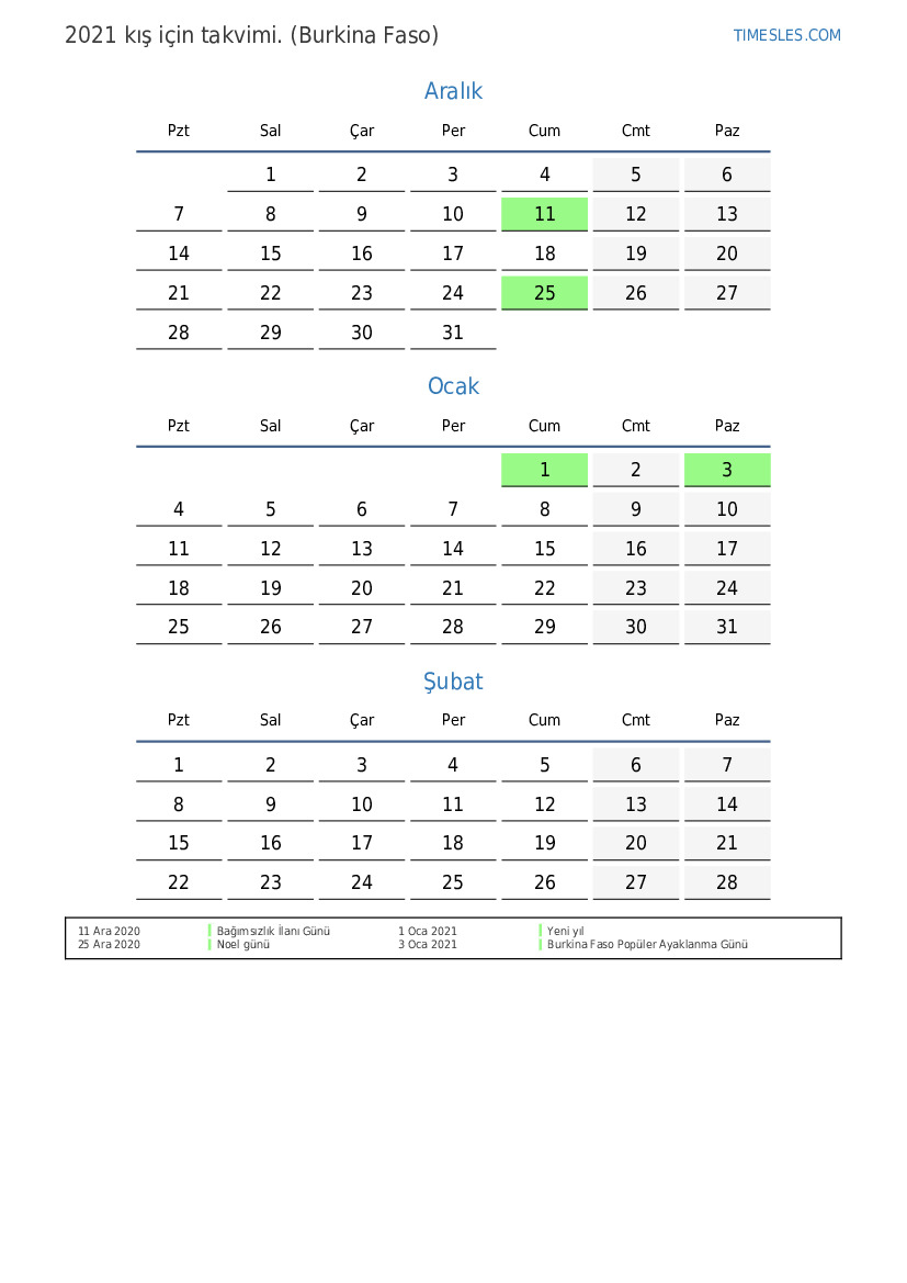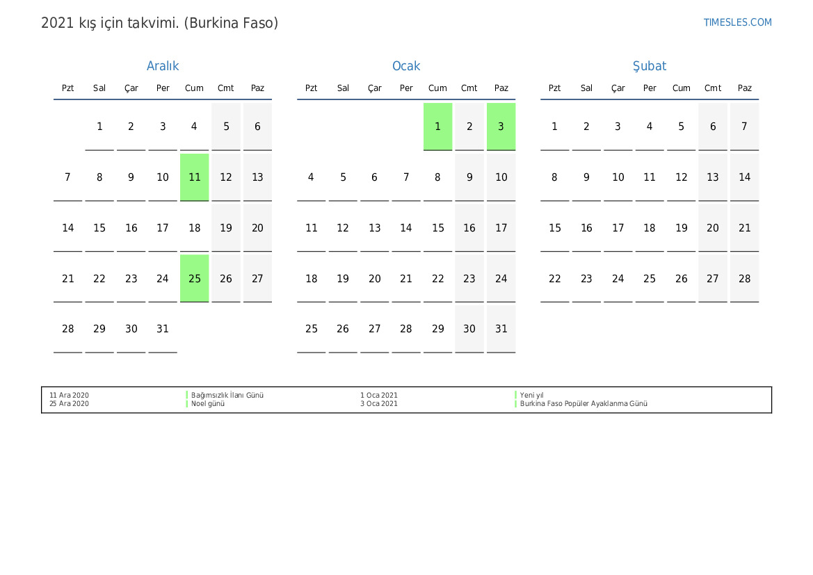 2021 Sonbaharda Burkina Faso'da 3 tatil ve tatil günleri var. Sonbahar 2021 Çarşamba günü başlar ve Salı günü biter.
