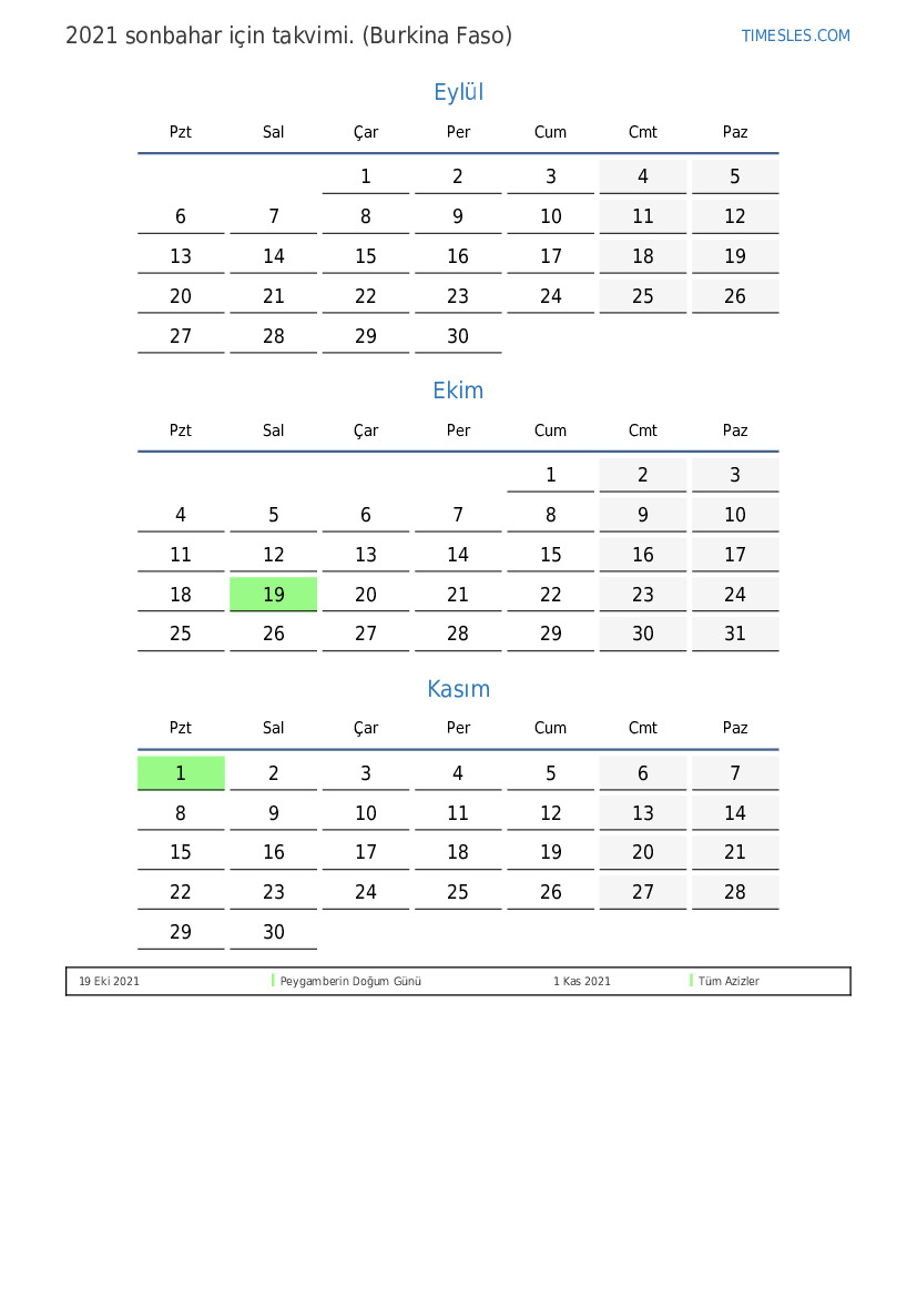Burkina Faso için 2021 sonbahar için tatiller ve hafta sonları içeren PDF takvimini indirin ve yazdırın