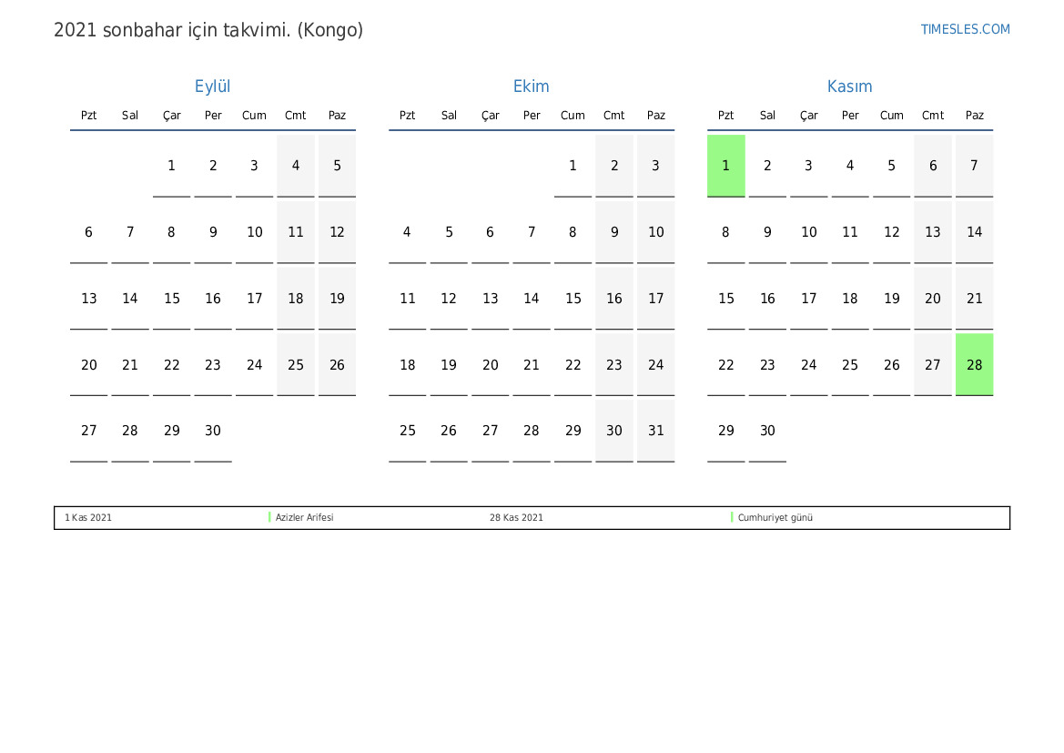 Kongo için 2021 sonbahar için tatiller ve hafta sonları içeren PDF takvimini indirin ve yazdırın