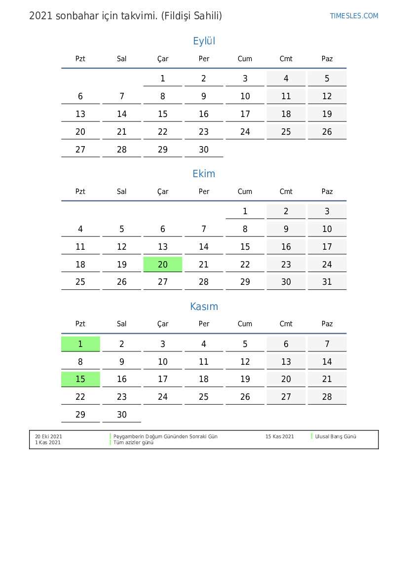 2021 Sonbaharda Fildişi Sahili'nde 4 tatil ve tatil günleri var. Sonbahar 2021 Çarşamba günü başlar ve Salı günü biter.