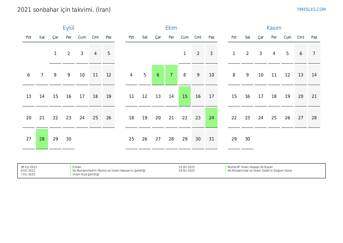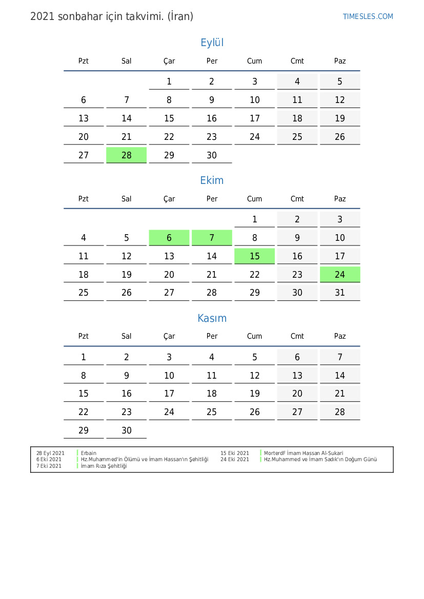 İran için 2021 sonbahar için tatil ve hafta sonları takvimi