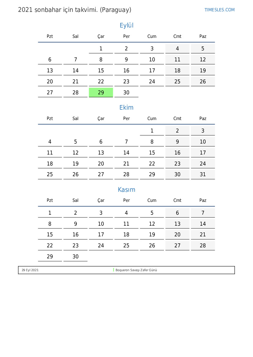 Paraguay için 2021 sonbahar için tatiller ve hafta sonları içeren PDF takvimini indirin ve yazdırın
