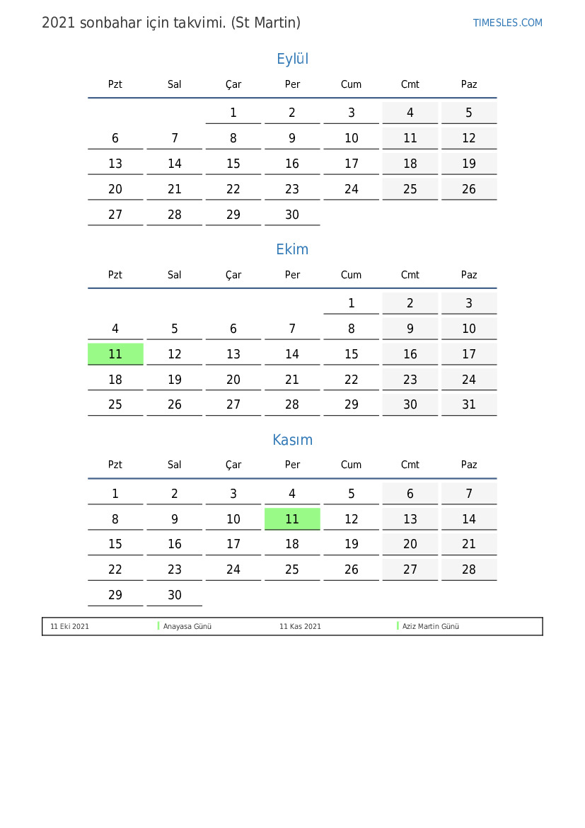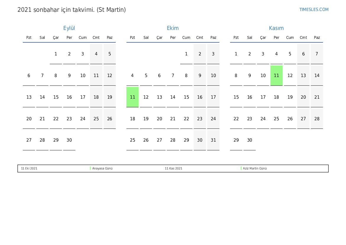 Sint Maarten için 2021 sonbahar için tatiller ve hafta sonları içeren PDF takvimini indirin ve yazdırın