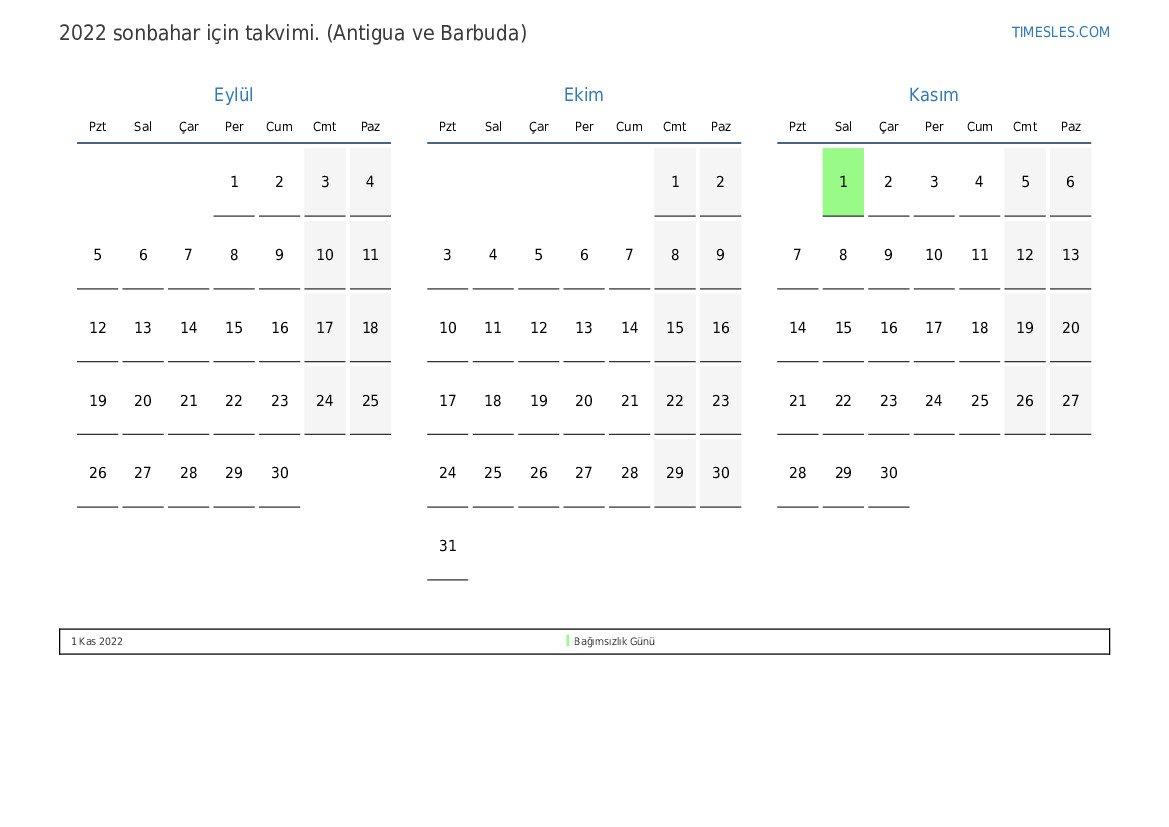 Antigua ve Barbuda'da 2022 sonbahar için takvimi