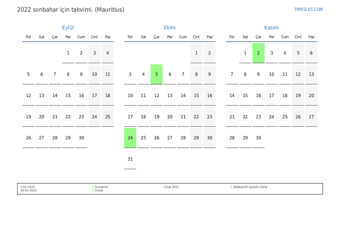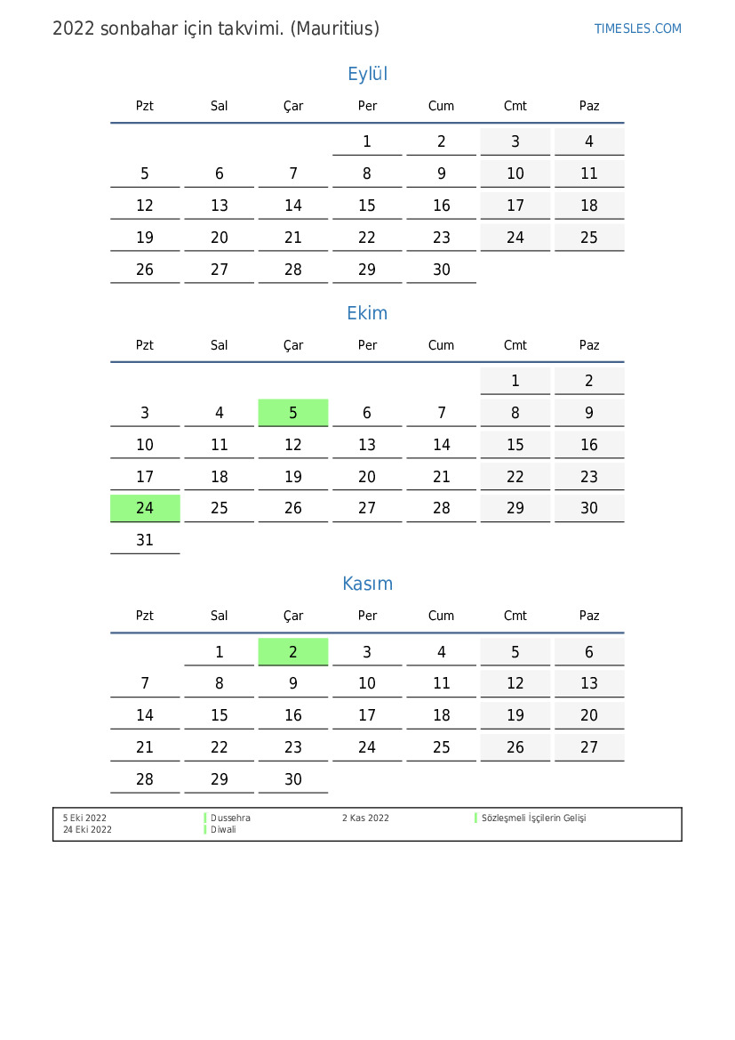 Mauritius için 2022 sonbahar için tatiller ve hafta sonları içeren PDF takvimini indirin ve yazdırın