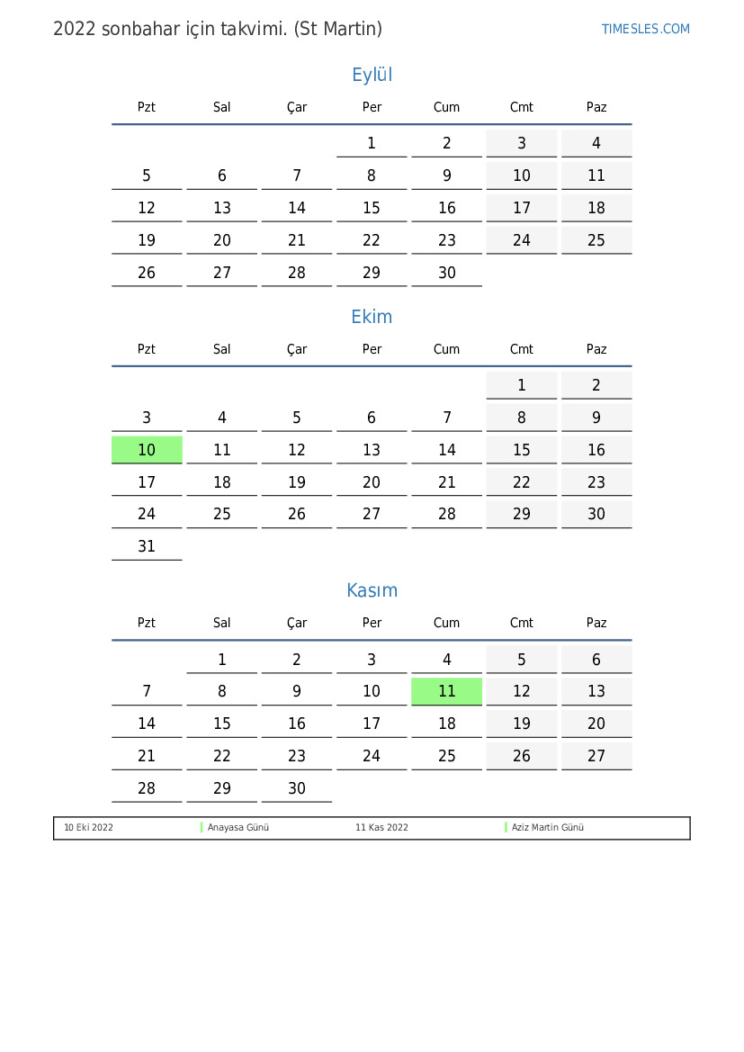 Sint Maarten için 2022 sonbahar için tatiller ve hafta sonları içeren PDF takvimini indirin ve yazdırın