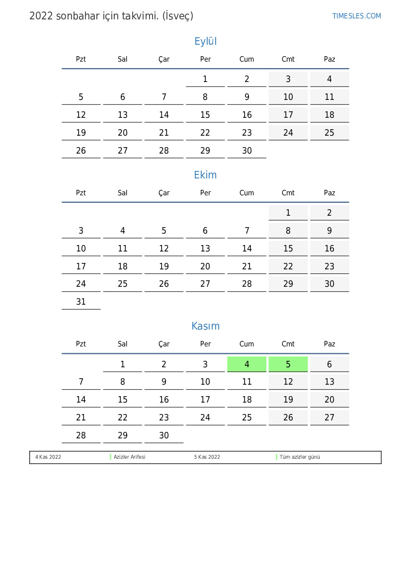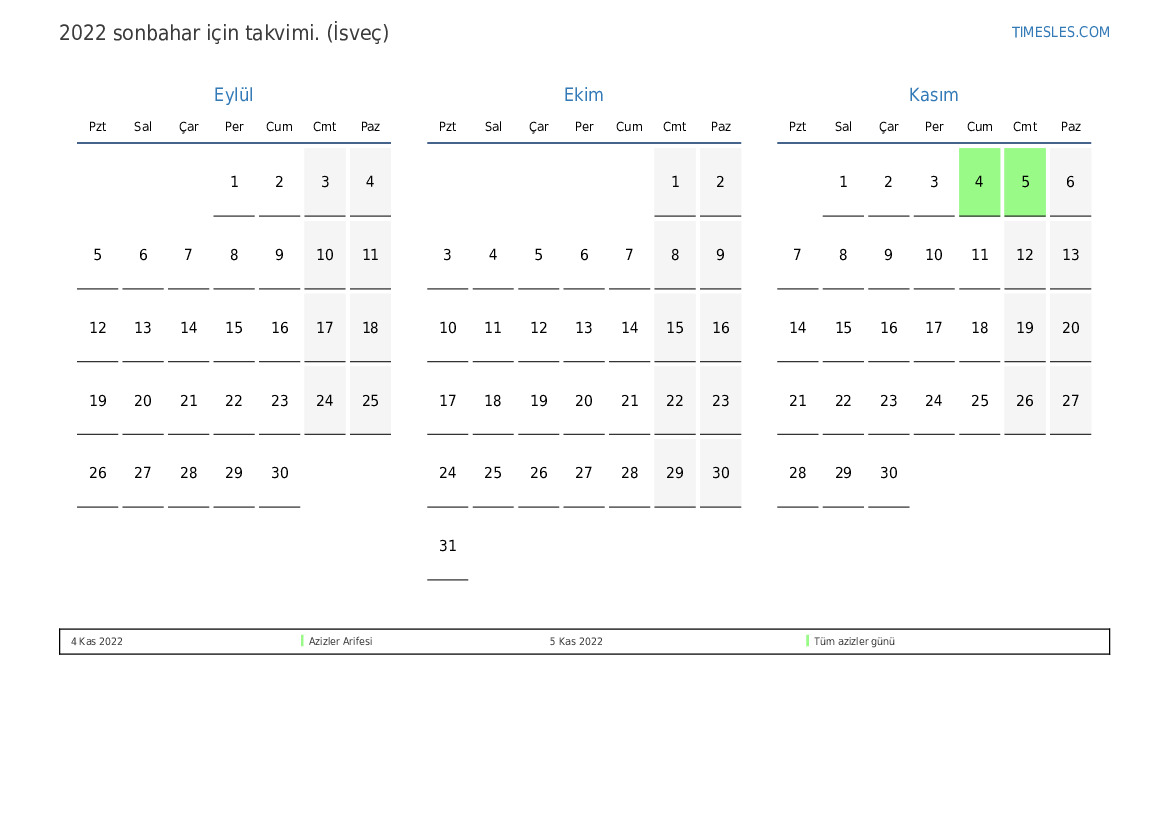 İsveç için 2022 sonbahar için tatiller ve hafta sonları içeren PDF takvimini indirin ve yazdırın