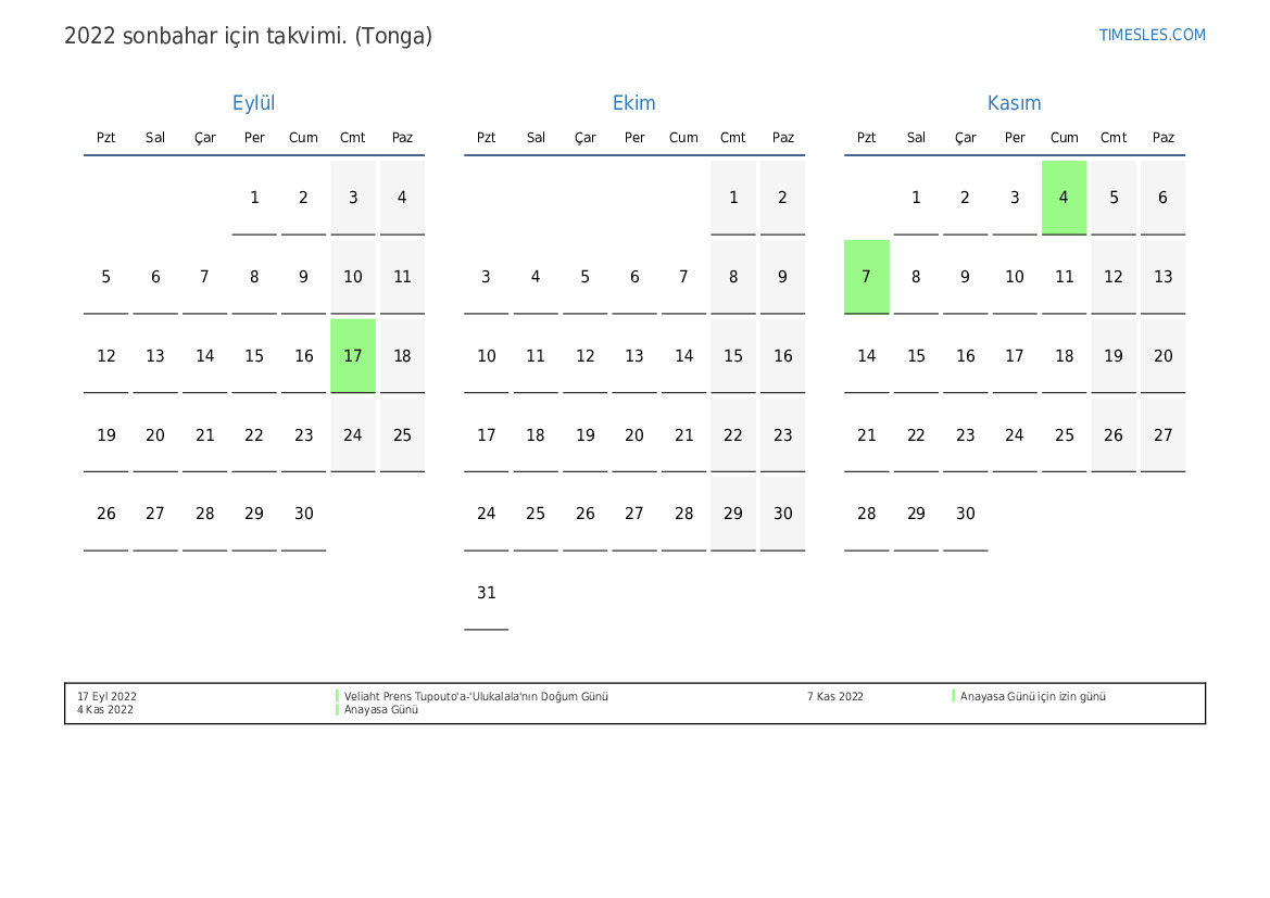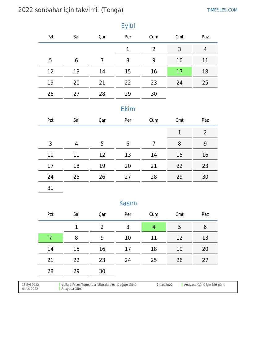 Tonga için 2022 sonbahar için tatiller ve hafta sonları içeren PDF takvimini indirin ve yazdırın