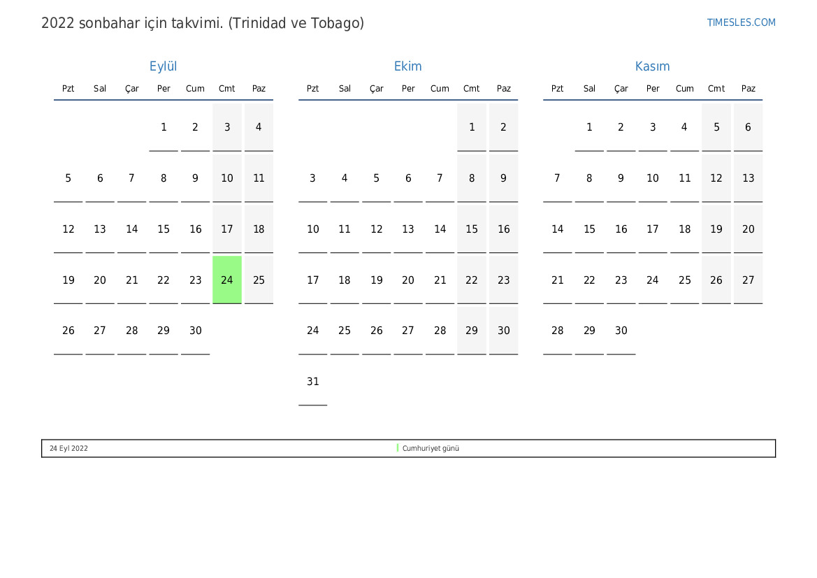 Trinidad ve Tobago için 2022 sonbahar için tatil ve hafta sonları takvimi
