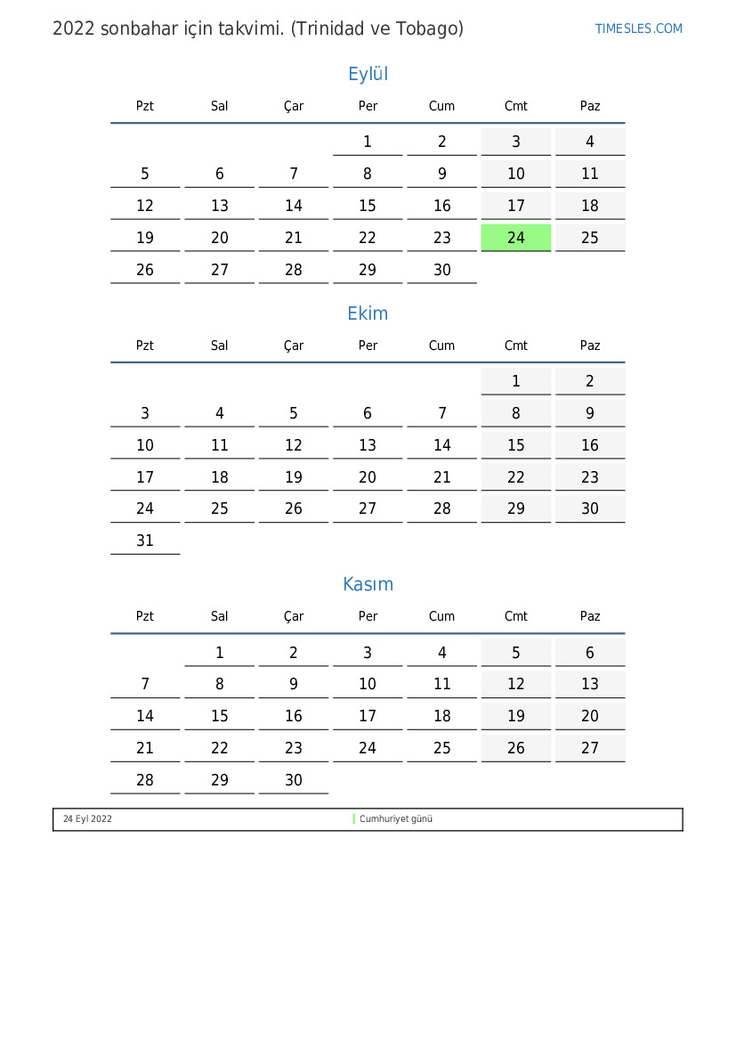 Trinidad ve Tobago için 2022 sonbahar için tatiller ve hafta sonları içeren PDF takvimini indirin ve yazdırın