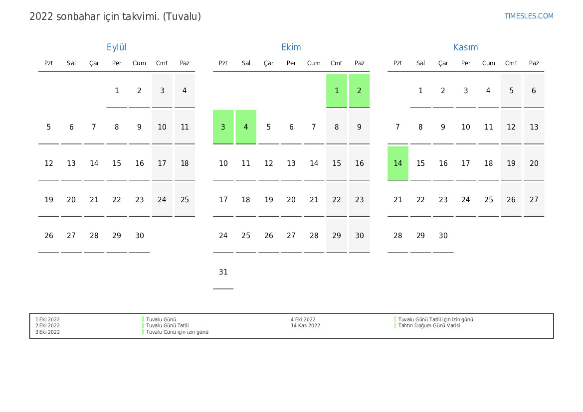 Tuvalu için 2022 sonbahar için tatiller ve hafta sonları içeren PDF takvimini indirin ve yazdırın