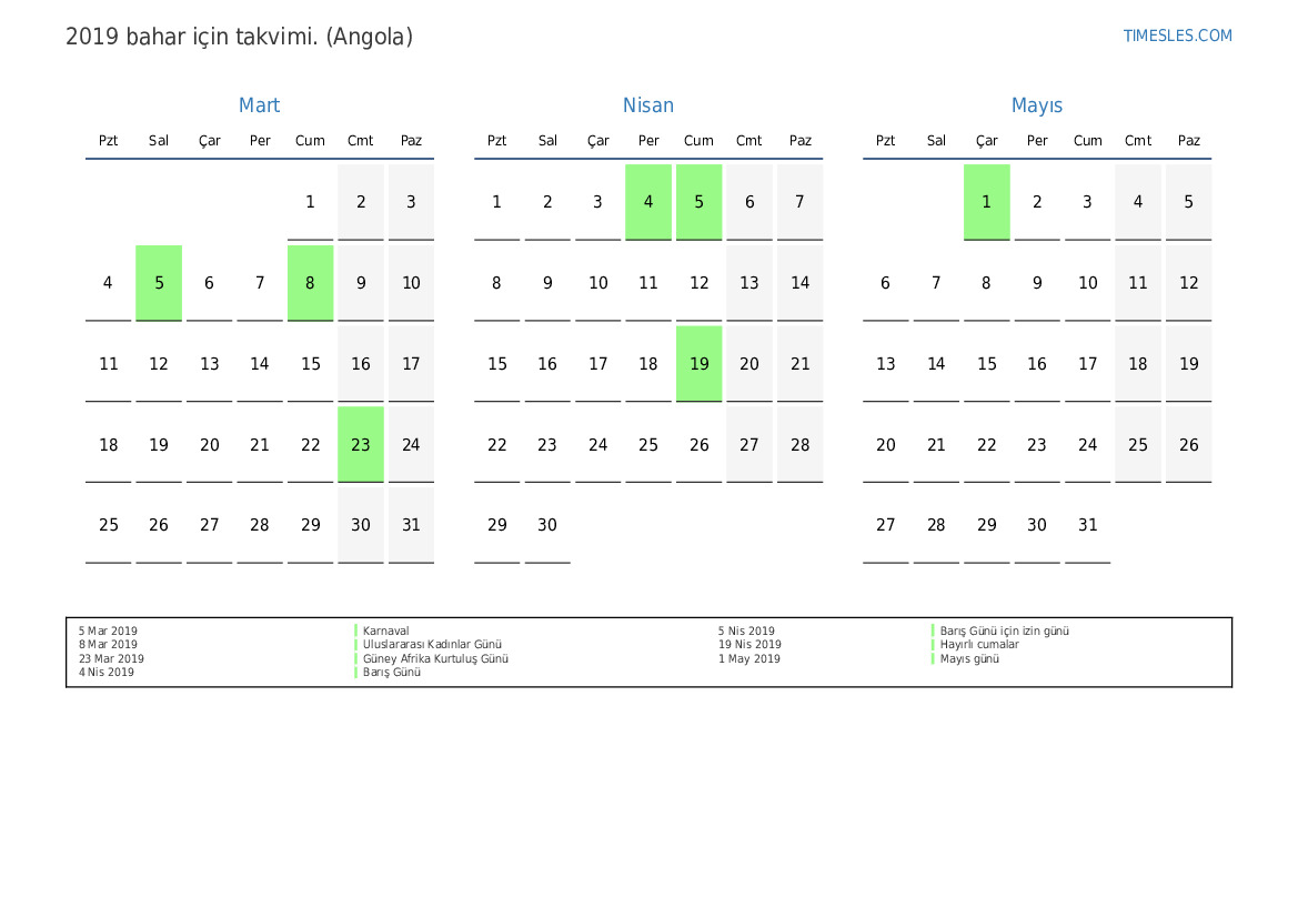 Angola için 2019 bahar için tatil ve hafta sonları takvimi