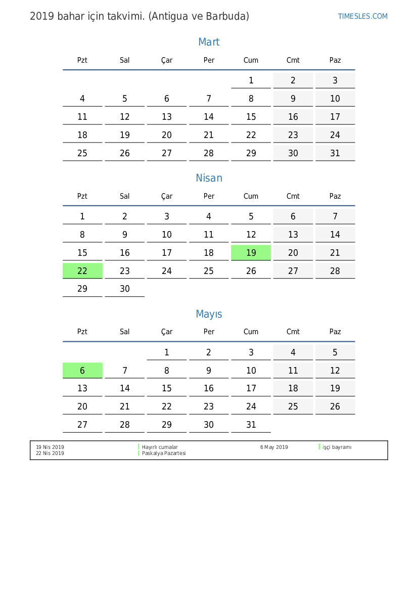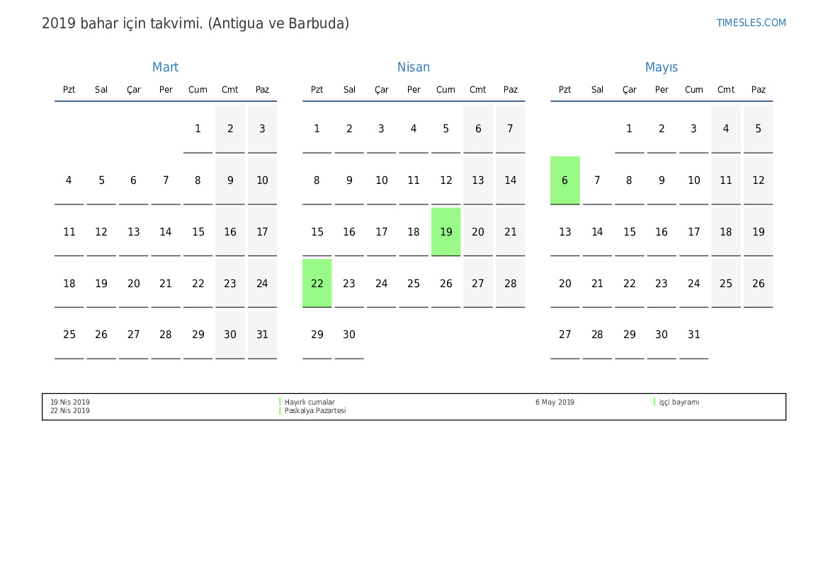 Antigua ve Barbuda için 2019 bahar için tatiller ve hafta sonları içeren PDF takvimini indirin ve yazdırın