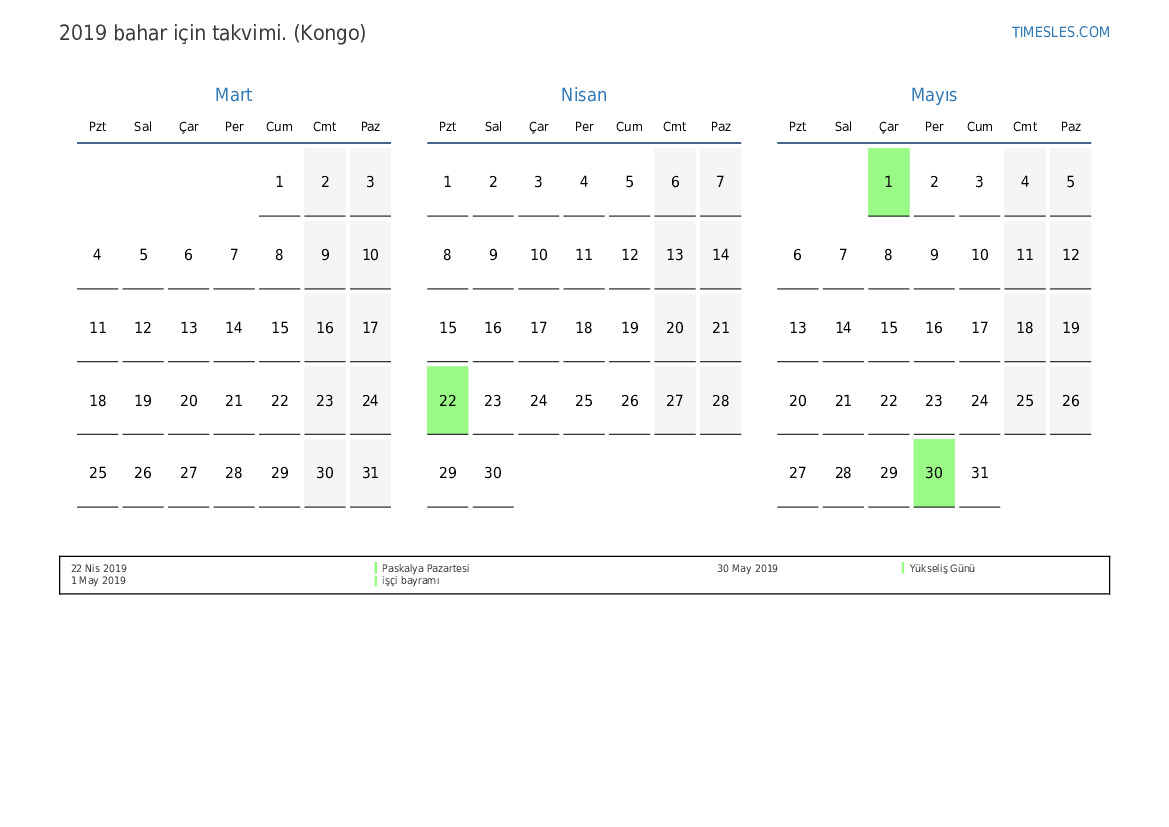Kongo için 2019 bahar için tatil ve hafta sonları takvimi