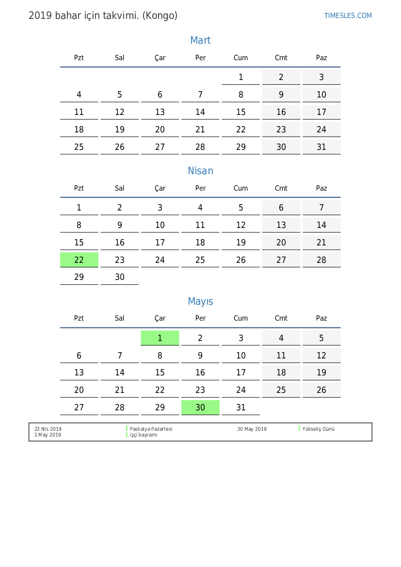 Kongo için 2019 bahar için tatiller ve hafta sonları içeren PDF takvimini indirin ve yazdırın