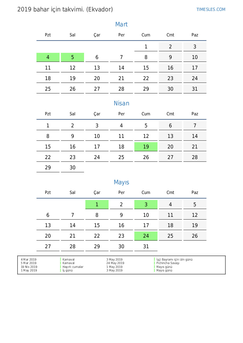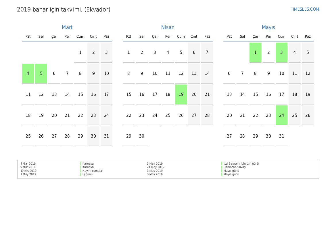 Ekvador için 2019 bahar için tatiller ve hafta sonları içeren PDF takvimini indirin ve yazdırın