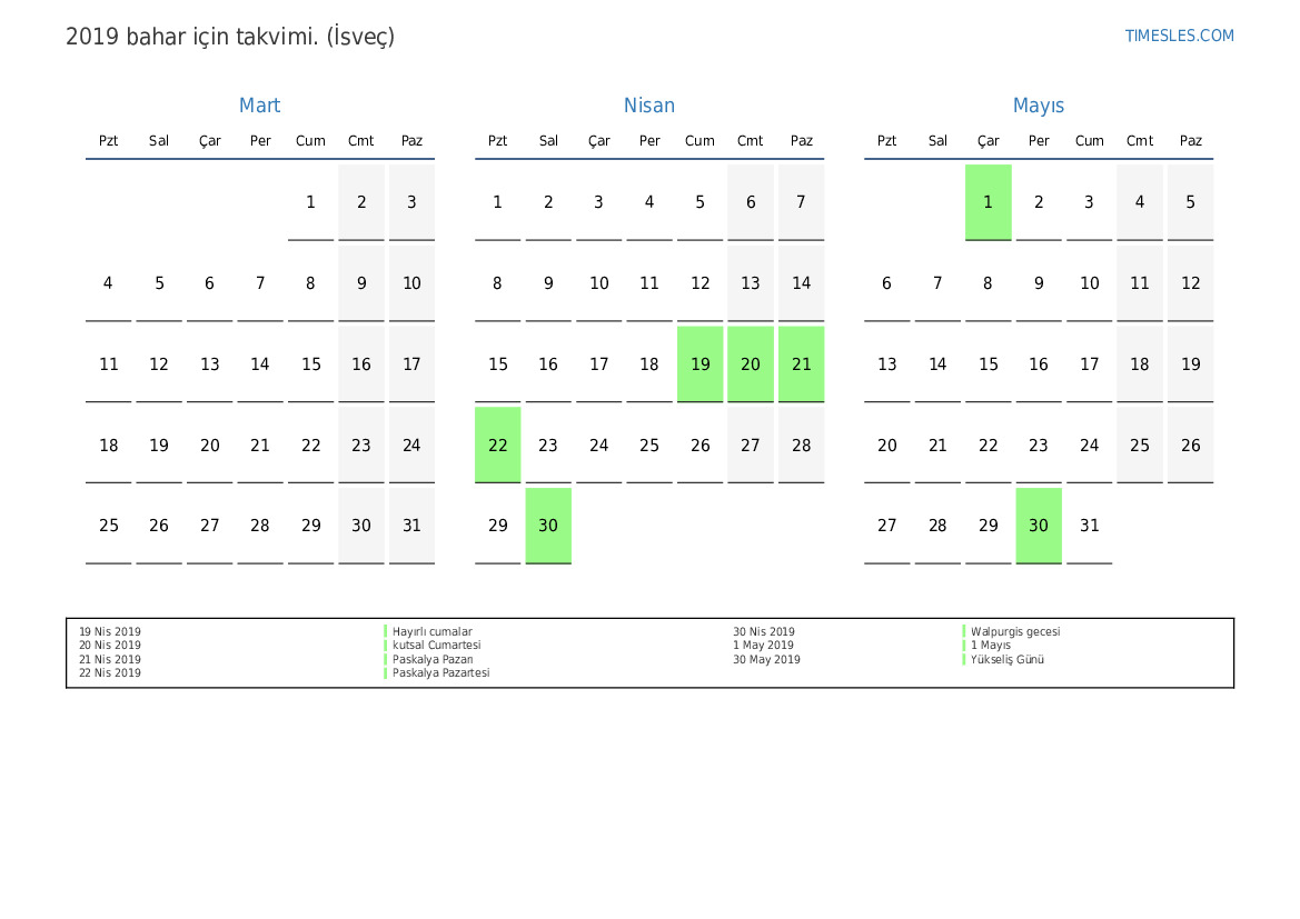 2019 Baharda isveçte 10 tatil ve tatil günleri var. İlkbahar 2019 Cuma gününde başlar ve Cuma gününde biter.