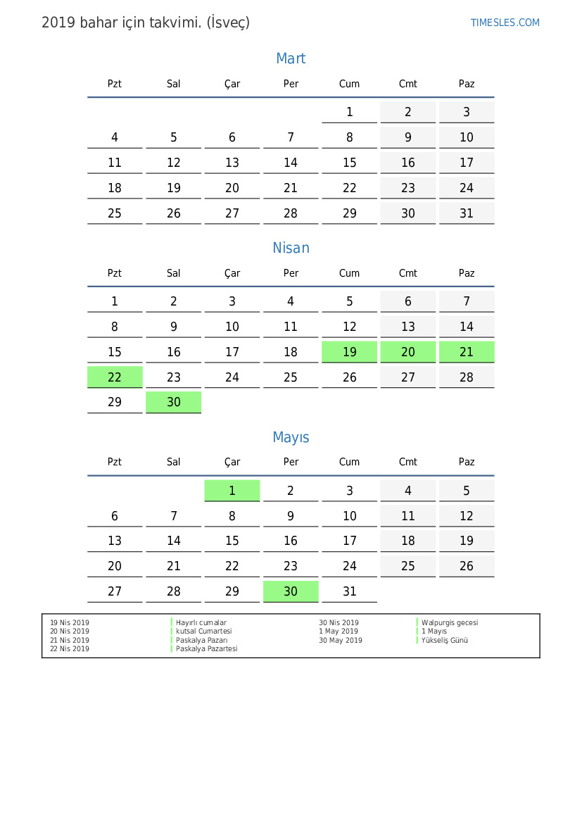 İsveç için 2019 bahar için tatiller ve hafta sonları içeren PDF takvimini indirin ve yazdırın